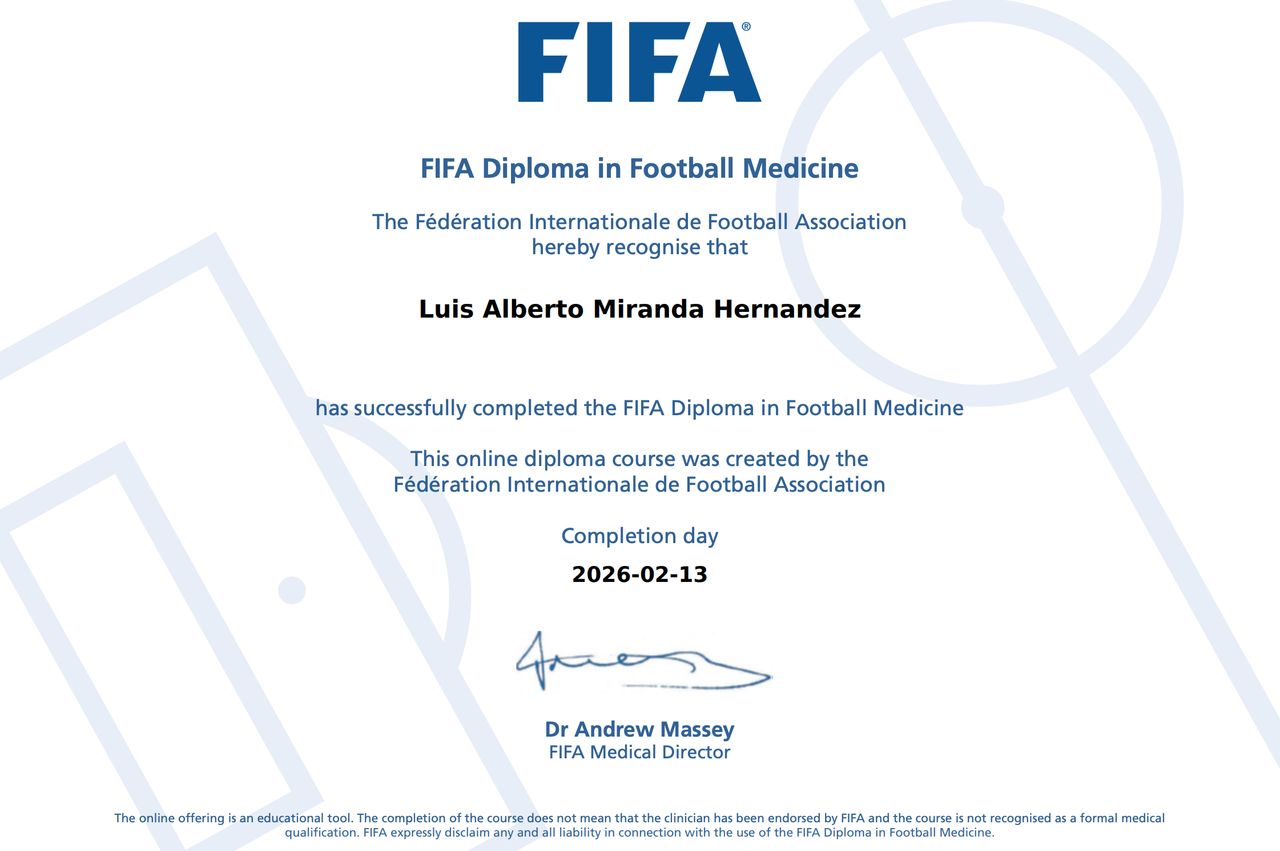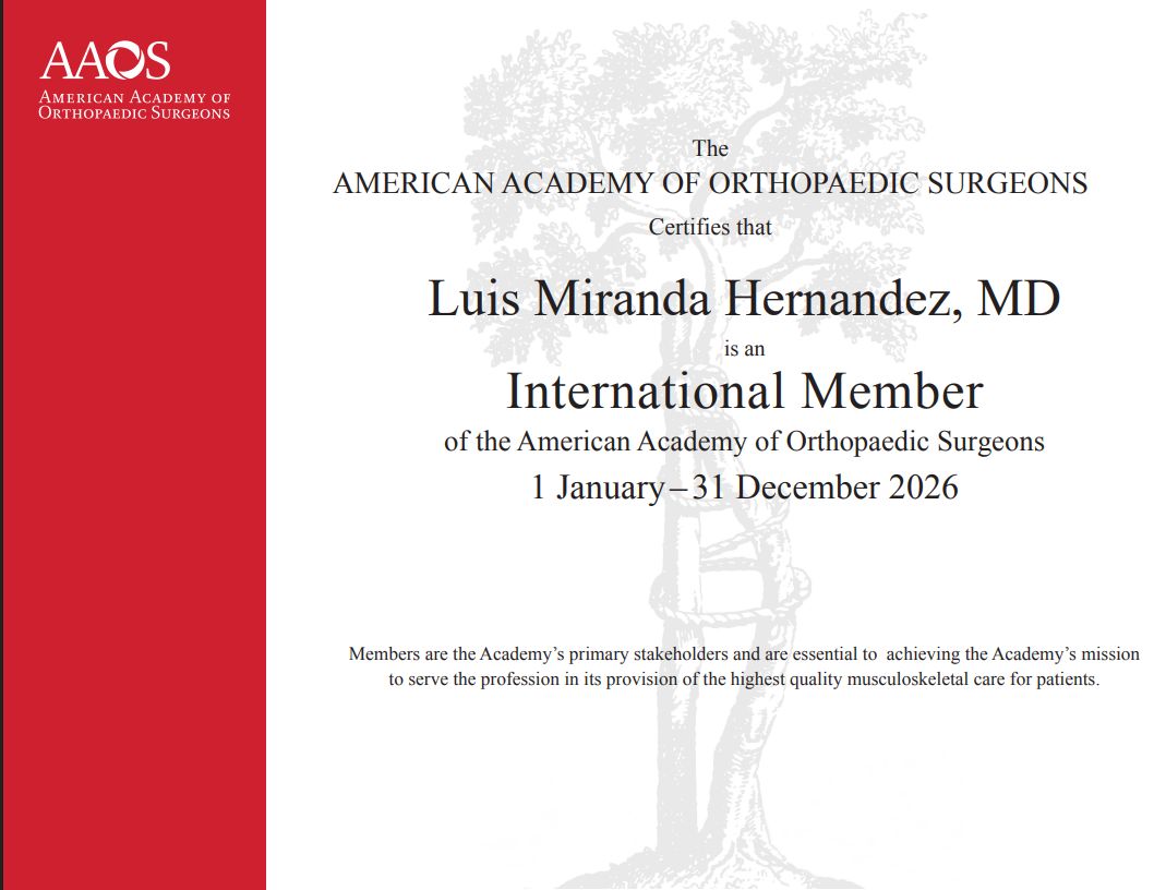 Además me encuentro afiliado a la Asociación Americana de Ortopedia y Traumatología (AAOS), la Asociación de Osteosintesis (Suiza), Médico FIFA y Médico de Deportes de Equipo (Barcelona Fútbol Club), miembro de AMECRA y el Colegio de Ortopedia y Traumatologia de NL ademas de estar certificado por el CONSEJO MEXICANO DE ORTOPEDIA Y TRAUMATOLOGIA