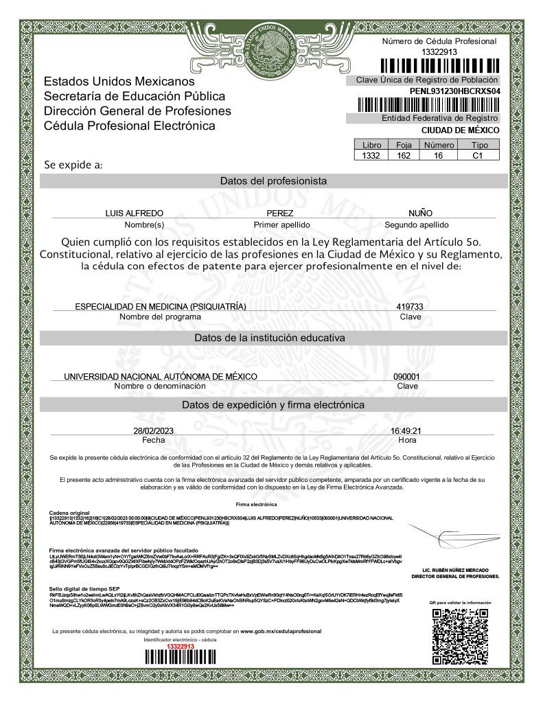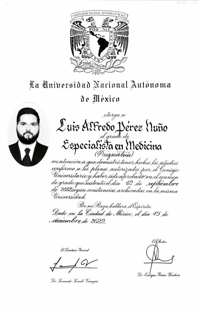 Hola! Mi nombre es Alfredo Pérez, soy médico psiquiatra, me dedico a atender las necesidades de salud mental: como pueden ser problemas de ansiedad, depresión, o síntomas que afecten tu calidad de vida como insomnio, cambios de tu manera de comer, y situaciones de vida que pudieran estar saliéndose de tus manos. En tu primera consulta buscaremos que necesidades de salud mental hay que atender, si te beneficiaría ir a terapia psicológica (y a que tipo de terapia), o si llegaras a necesitar medicamento. Si fuera el caso, es importante para mí que sepas que el medicamento en casi todos los casos es por sólo un periodo en tu vida, no causan dependencia, y no cambian quien somos; más bien nos permiten que te vuelvas a sentir como tú eres. Consulta para adolescentes a partir de 15 años, previo consentimiento de los padres, acompañados en el caso de consulta presencial. Consulta disponible para adultos y adultos mayores. En caso de depender de otra persona para su funcionamiento, necesita acudir a sus citas en compañía de un familiar. Si no ves disponible el horario que necesitas, o si necesitas una cita fuera de los horarios ofertados, no dudes en mandarme mensaje a través de la aplicación de doctoralia
