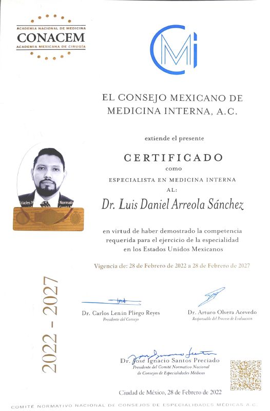 Medicina Interna por la Universidad Autónoma de Nuevo León en la UMAE 25 en Monterrey, Nuevo León. Certificado por el Consejo Mexicano de Medicina Interna con número 06816-22.