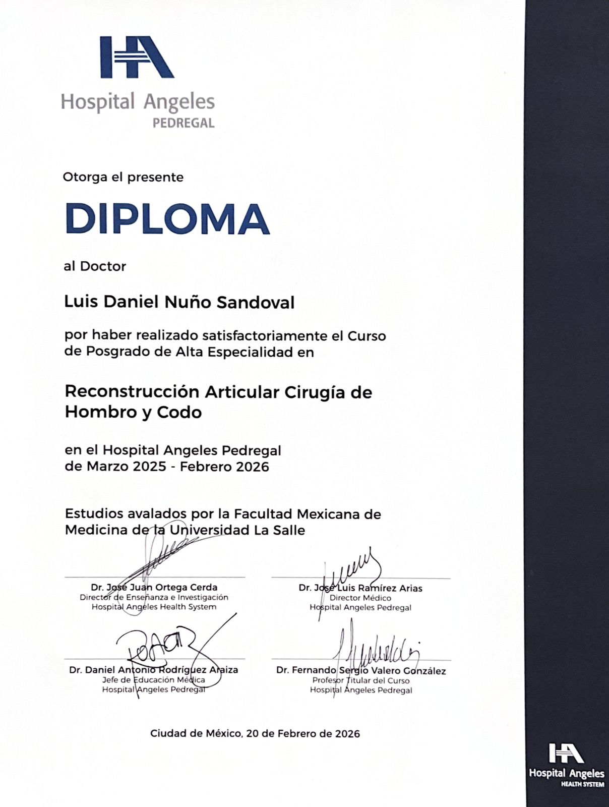 Hola!, soy el doctor Daniel Nuño, Traumatólogo Ortopedista con Alta Especialidad en Reconstrucción Articular de Hombro y Codo realizada en el Hospital Ángeles Pedregal (CDMX) y avalada por la Universidad La Salle. Mi práctica profesional está centrada en la resolución de patologías de miembro superior, utilizando técnicas quirúrgicas avanzadas para devolver la movilidad y funcionalidad a mis pacientes.