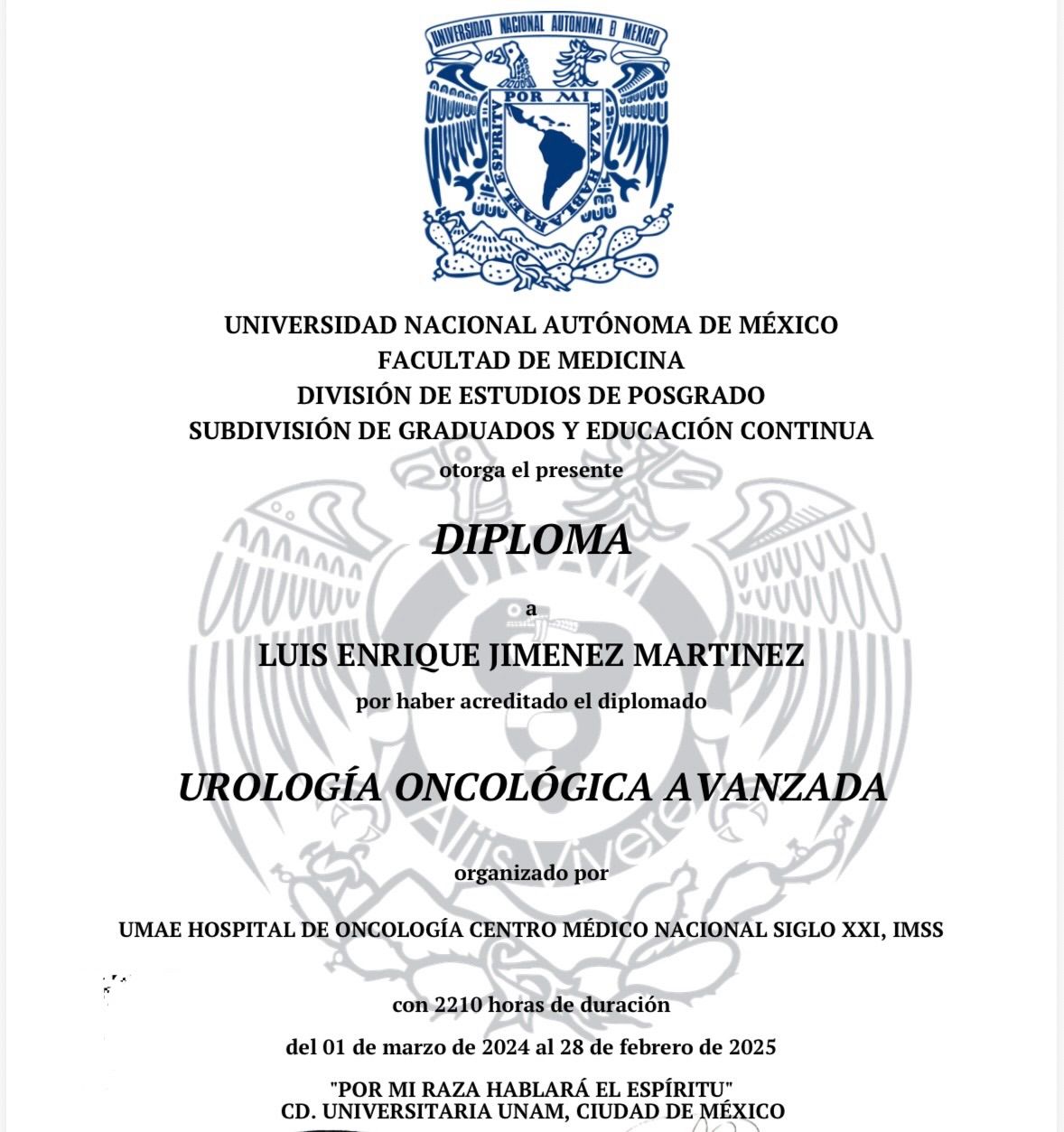 7 años para obtener el título de médico general, 5 años para obtener el título de urólogo y 1 año más para completar la formación como urólogo oncólogo. Dentro de mi experiencia he participado en cientos de cirugías oncológicas urológicas con buenos resultados y en la atención de miles de pacientes. Amplia experiencia en cirugía urológica oncológica de alta complejidad como resección de tumores renales, prostáticos, vesicales y testiculares; prostatectomía radical, nefrectomía parcial o total, cistectomía, linfadenectomía pélvica, cirugía mínimamente invasiva robótica y laparoscópica, manejo de pacientes con metástasis y reconstrucción del tracto urinario. La experiencia no se limita al tratamiento del cáncer de las vías urinarias, ya que la formación como urólogo permite el tratamiento adecuado de patologías benignas como la hiperplasia prostática benigna o la litiasis urinaria, las cuales también forman parte del actuar del día a día. Acude con médicos especialistas certificados.