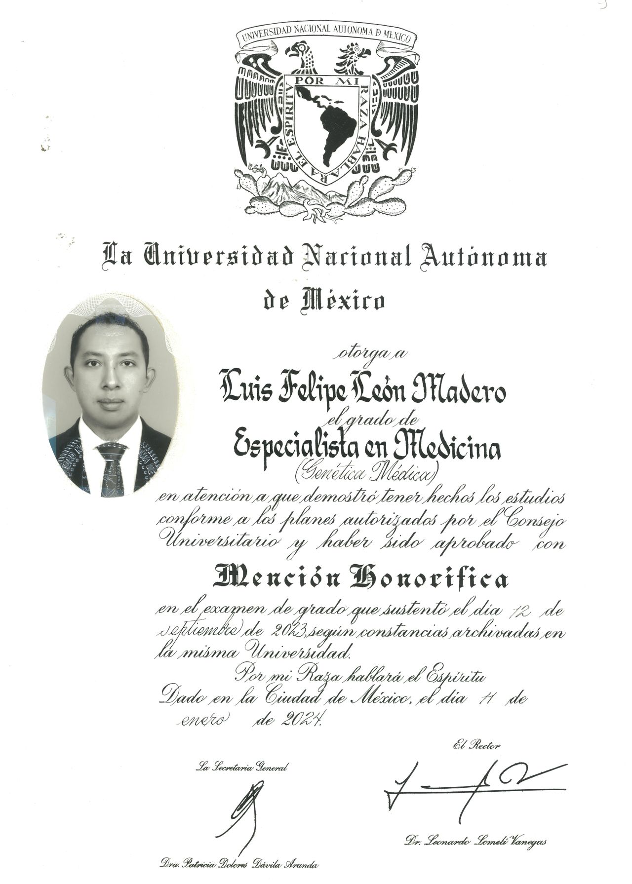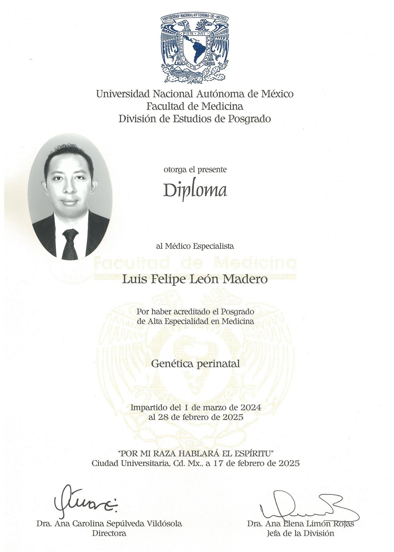 Me interesé por el área Prenatal y Perinatal de la Genética por lo que cursé un Posgrado de Alta Especialidad en Genética Perinatal en el Instituto Nacional de Perinatología (INPer) donde forme parte de grupos de trabajo con otras especialidades como Medicina Materno Fetal, Neonatología y Biología de la Reproducción, graduándome también con Mención Honorífica.