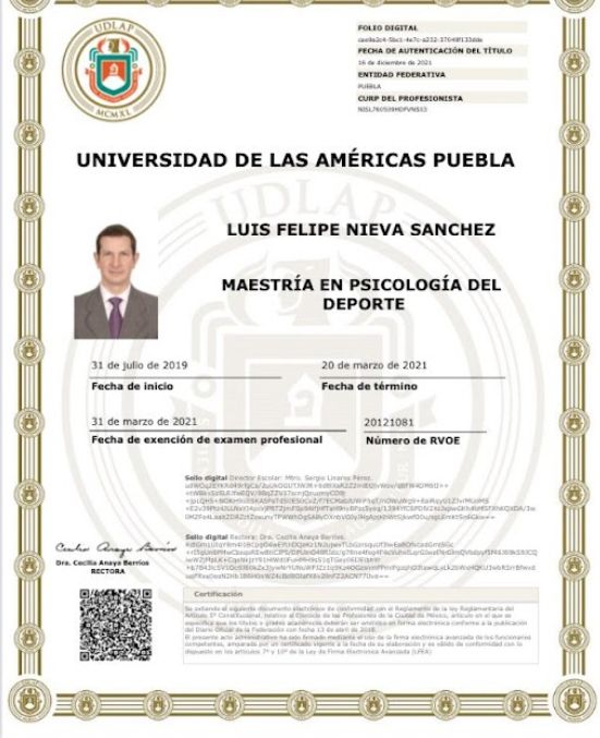 Soy el Psicólogo Luis Felipe Nieva Sánchez. Cuento con más de 20 años de trayectoria profesional tras egresar de la Universidad Intercontinental. Con el objetivo de potenciar el rendimiento y bienestar mental de los deportistas, realicé mi Maestría en Psicología del Deporte en la Universidad de las Américas Puebla (UDLAP). Mi enfoque combina la experiencia clínica con herramientas especializadas para el manejo de la presión, motivación y metas en el ámbito deportivo.