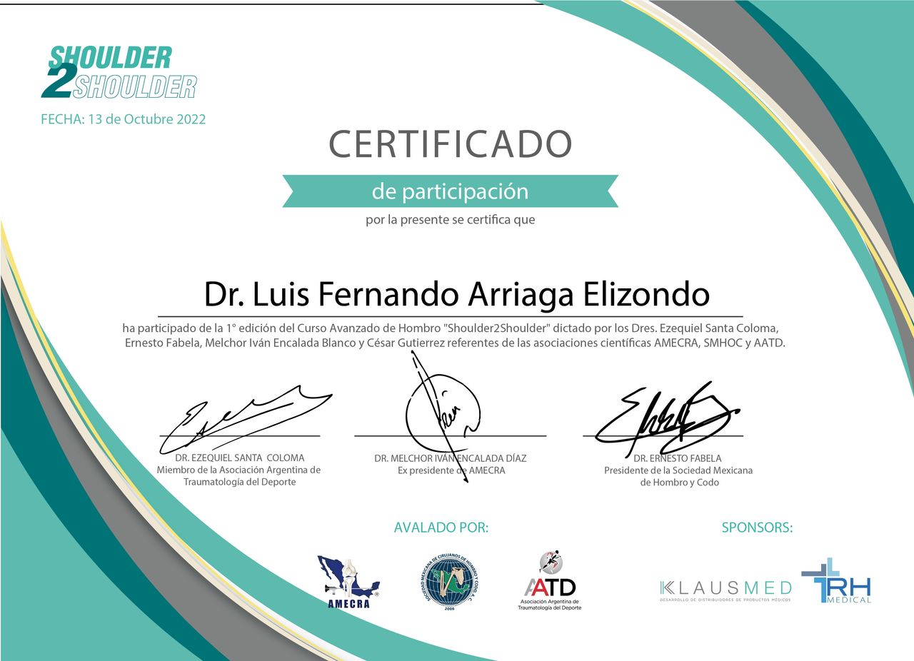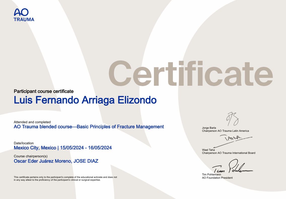 Certificado por el CONSEJO MEXICANO DE TRAUMATOLOGIA Y ORTOPEDIA.
