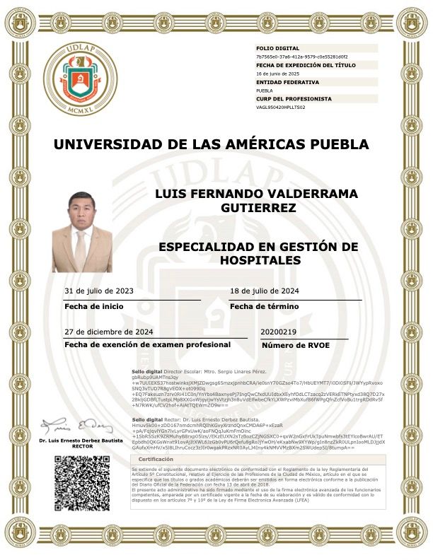 Universidad de las Américas Puebla en la Especialidad en Gestión Hospitalaria