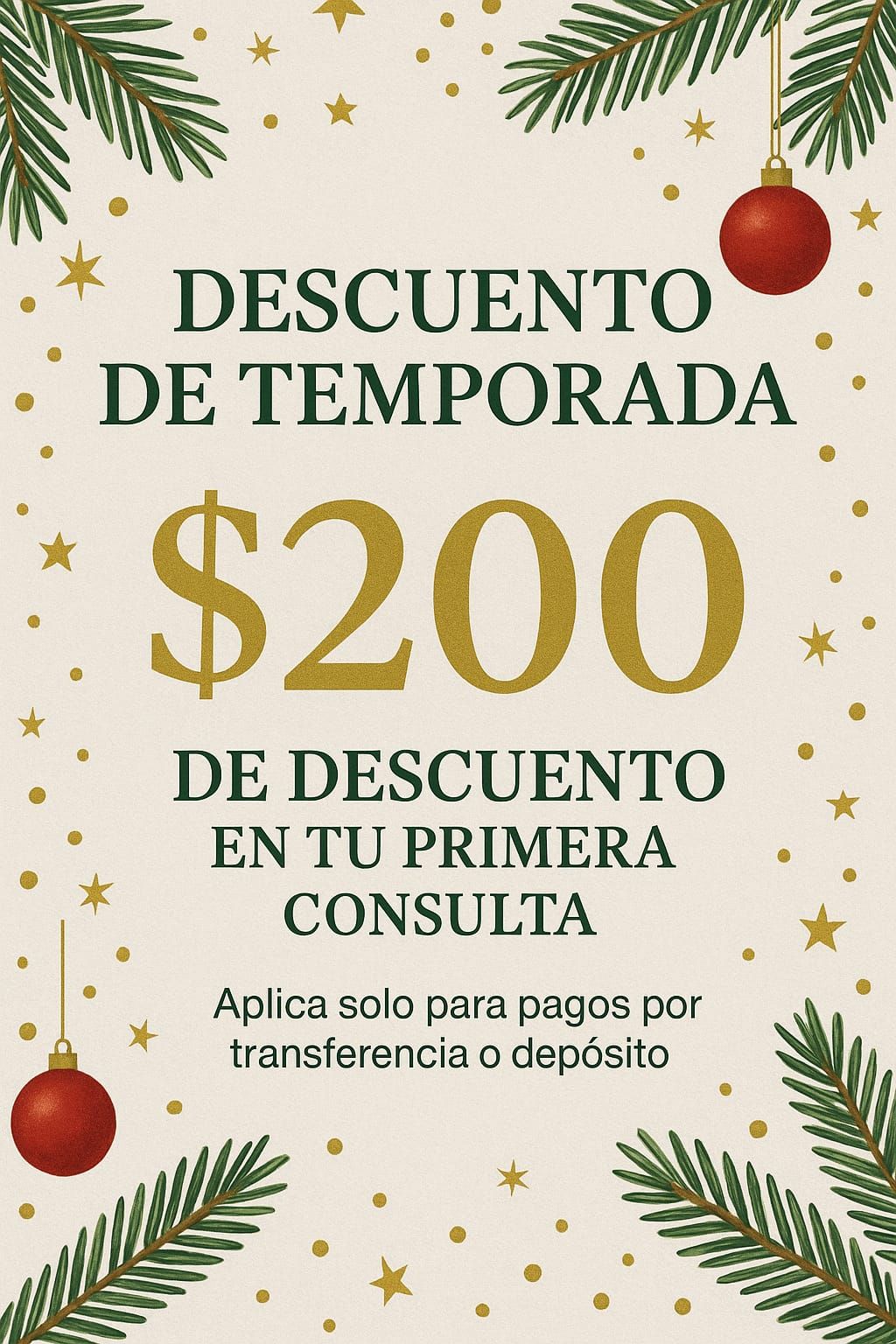 Como incentivo de aquí hasta que termine el 2025 te otorgo este descuento de $200 pesos en tu primera consulta.