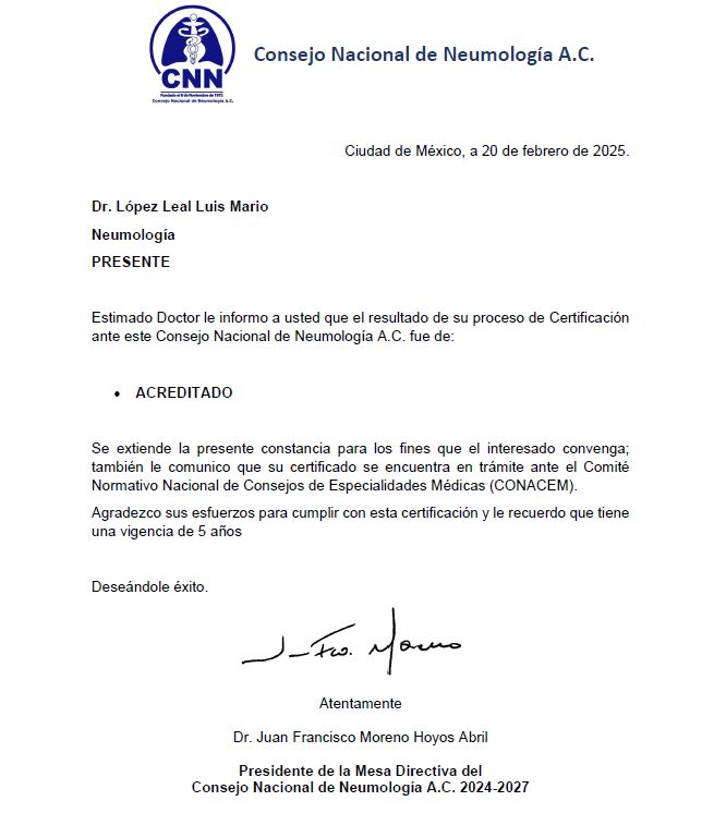 Soy especialista en Neumología, formado en la Unidad Médica de Alta Especialidad #34 (Monterrey, N.L.), con aval académico de la Universidad de Monterrey (UDEM). Estoy certificado por el Consejo Nacional de Neumología, lo que respalda que mi práctica médica se mantiene actualizada y basada en estándares de calidad.