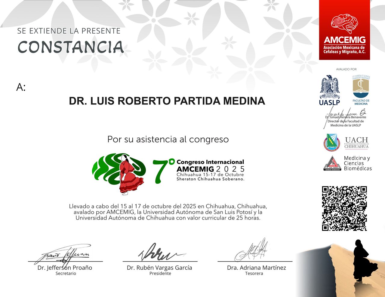 Obtuve un Máster en Neurociencias por parte de La Universidad de Barcelona. Posteriormente, realicé dos Máster Class en cefaleas siendo certificado por la International Headache Society y la Asociación Colombiana de Neurología y la AMCEMIG, donde adquirí una sólida formación en el diagnóstico y tratamiento de las diversas formas de cefalea.