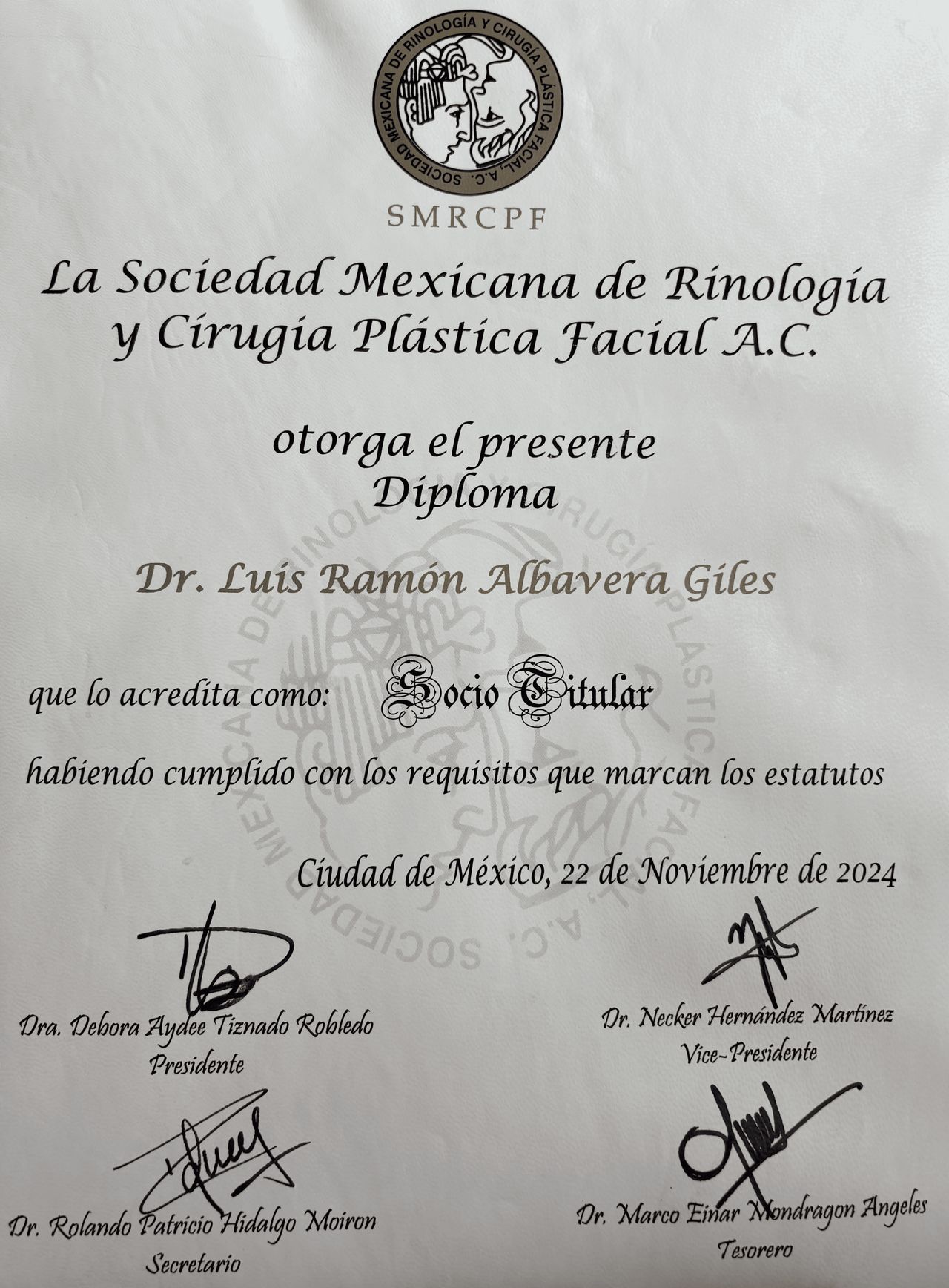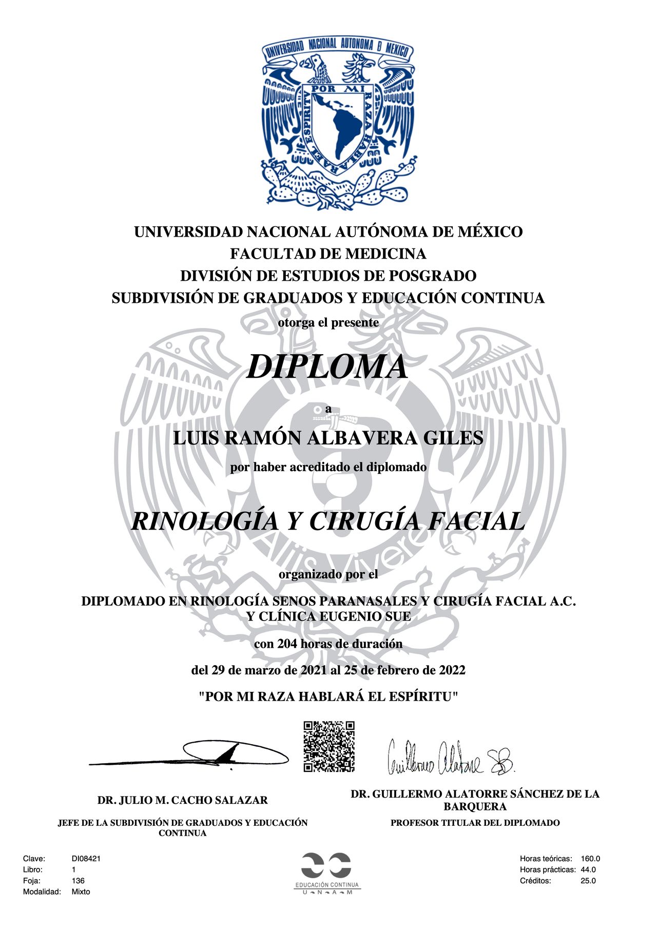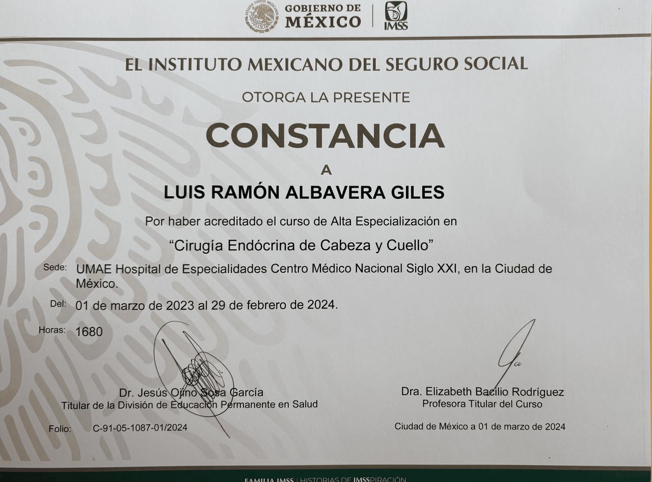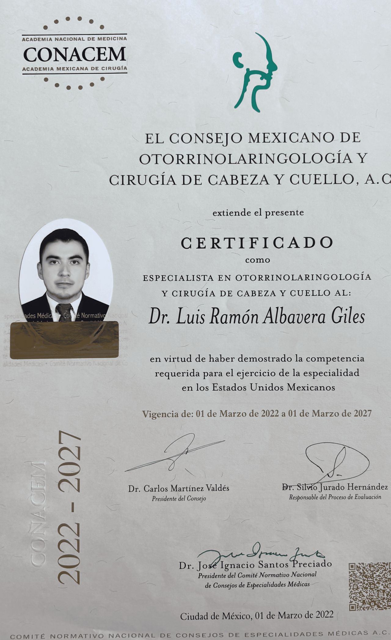 Tengo un diplomado en Rinología y Cirugía Facial avalado por la UNAM y otro de Laringología y Fonocirugía. Actualmente soy médico adscrito al servicio de Cirugia de Cabeza y Cuello en el Hospital de Especialidades del CMN Siglo XXI del IMSS en la Ciudad de México.