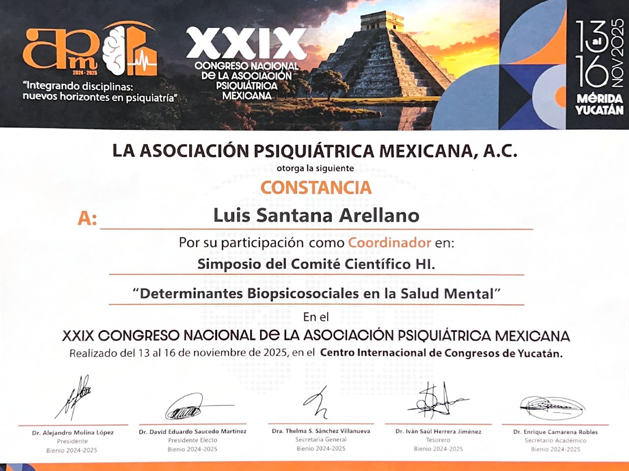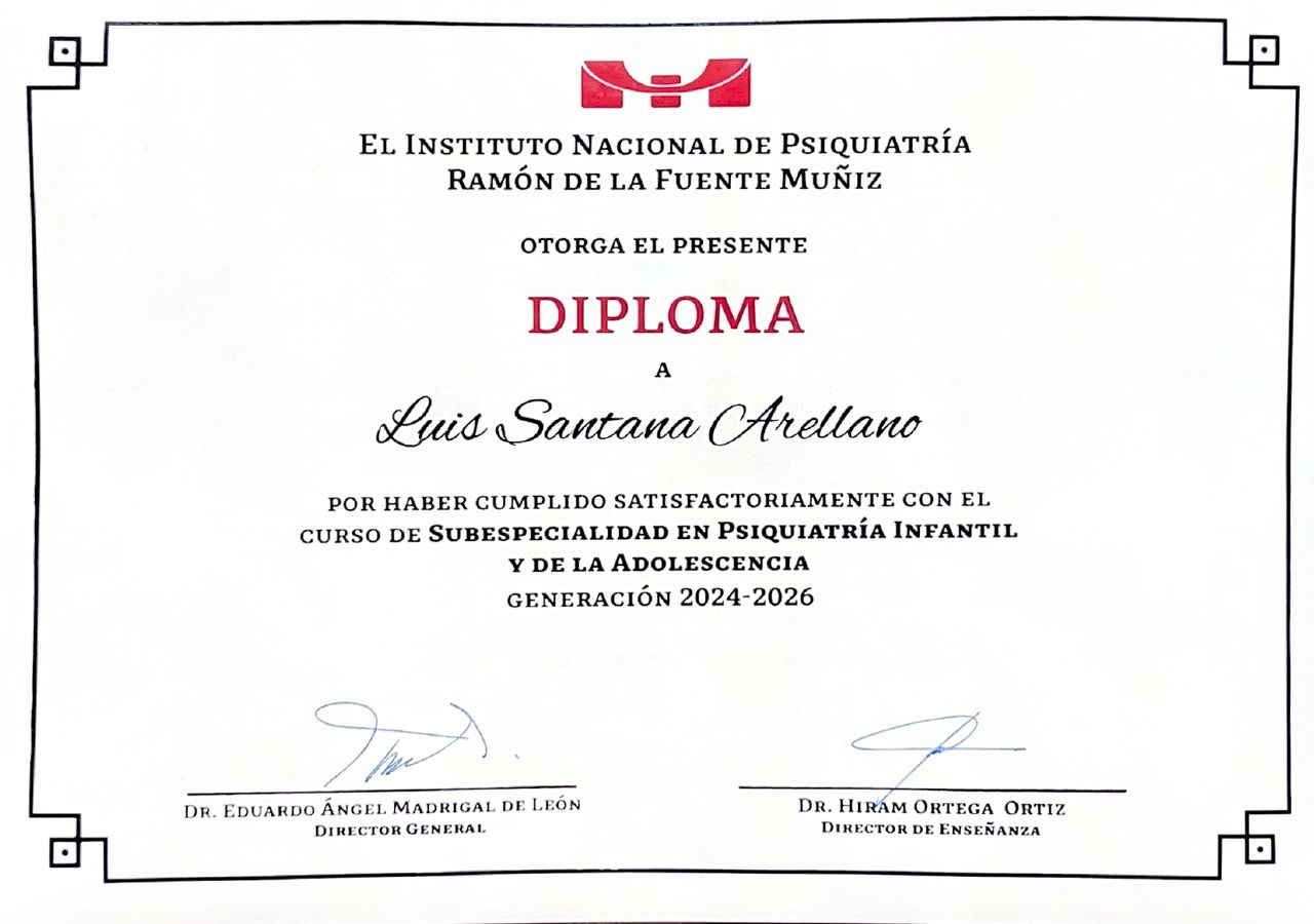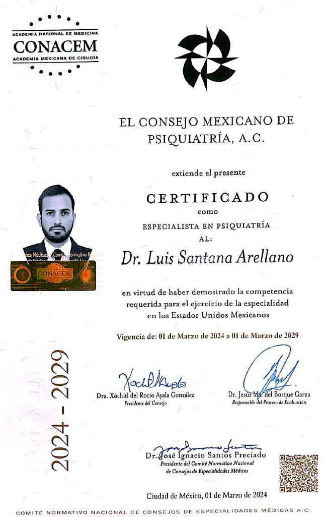 39 opiniones¡Hola! Soy el Dr. Luis Santana, Psiquiatra y Psiquiatra Infantojuvenil, egresado del Instituto Nacional de Neurología y Neurocirugía (Psiquiatría) y del Instituto Nacional de Psiquiatría (Paidopsiquiatría/Psiquiatría Infantojuvenil).