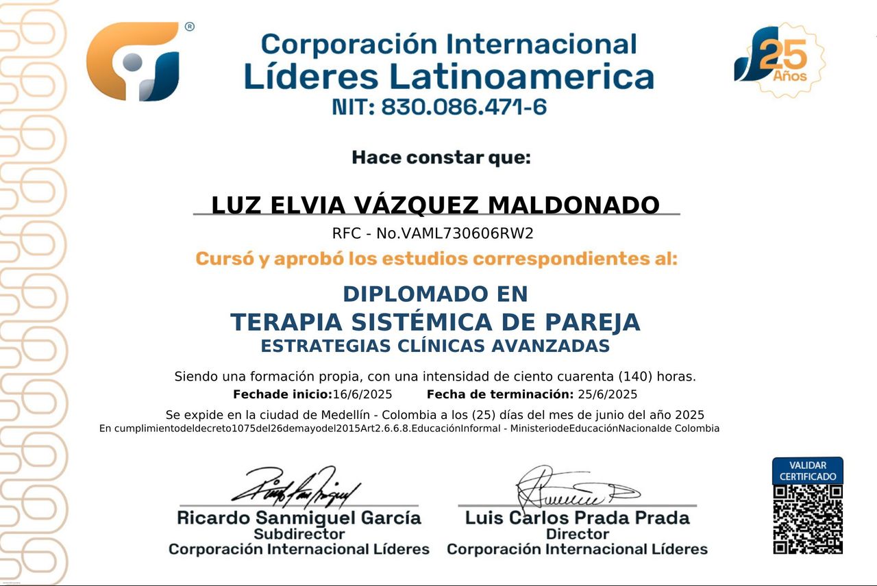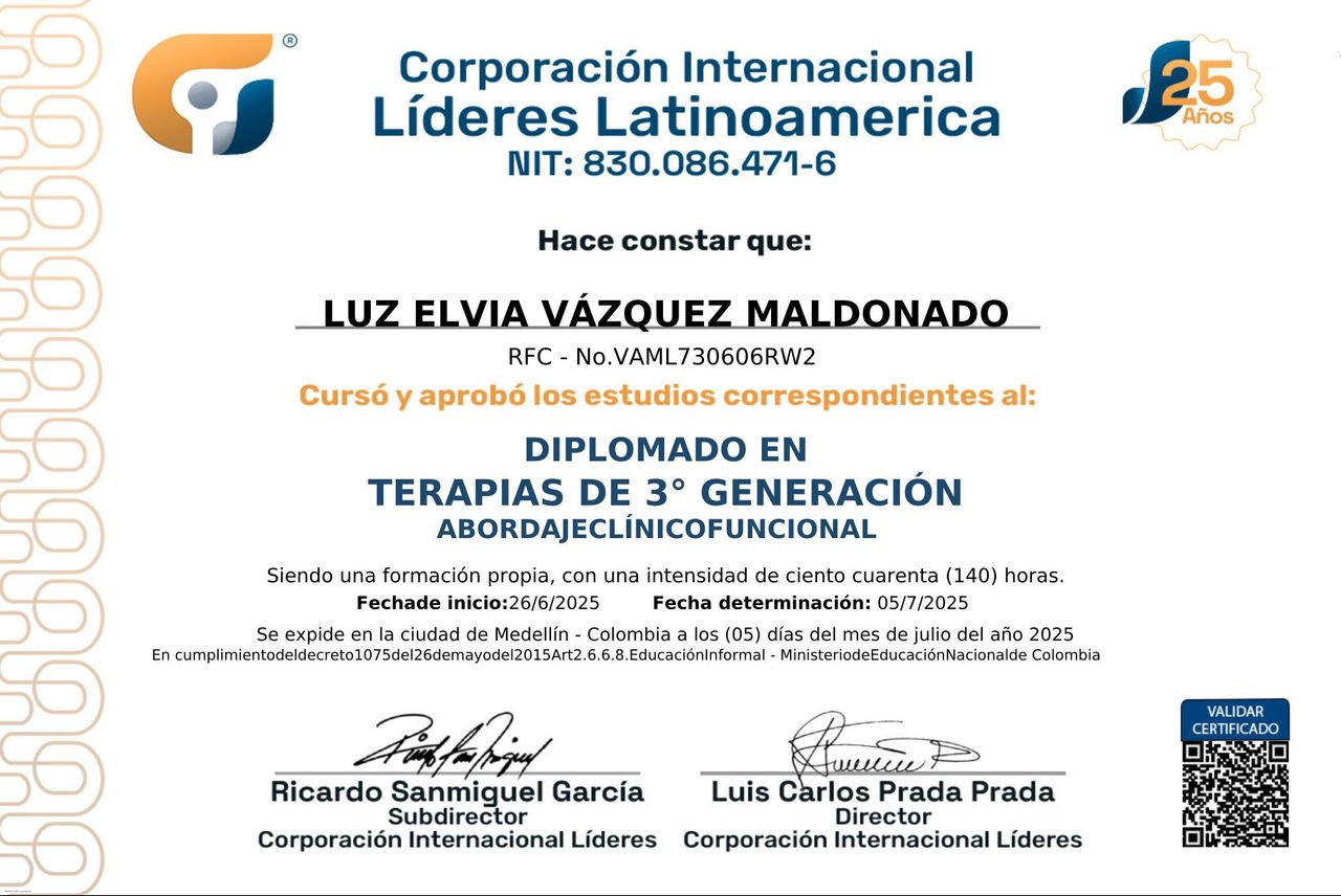 Hoy, continúa consolidándose como terapeuta y promotora del bienestar emocional, integrando su vasta experiencia laboral, clínica y humana para acompañar a individuos y equipos en el logro de su mayor potencial.