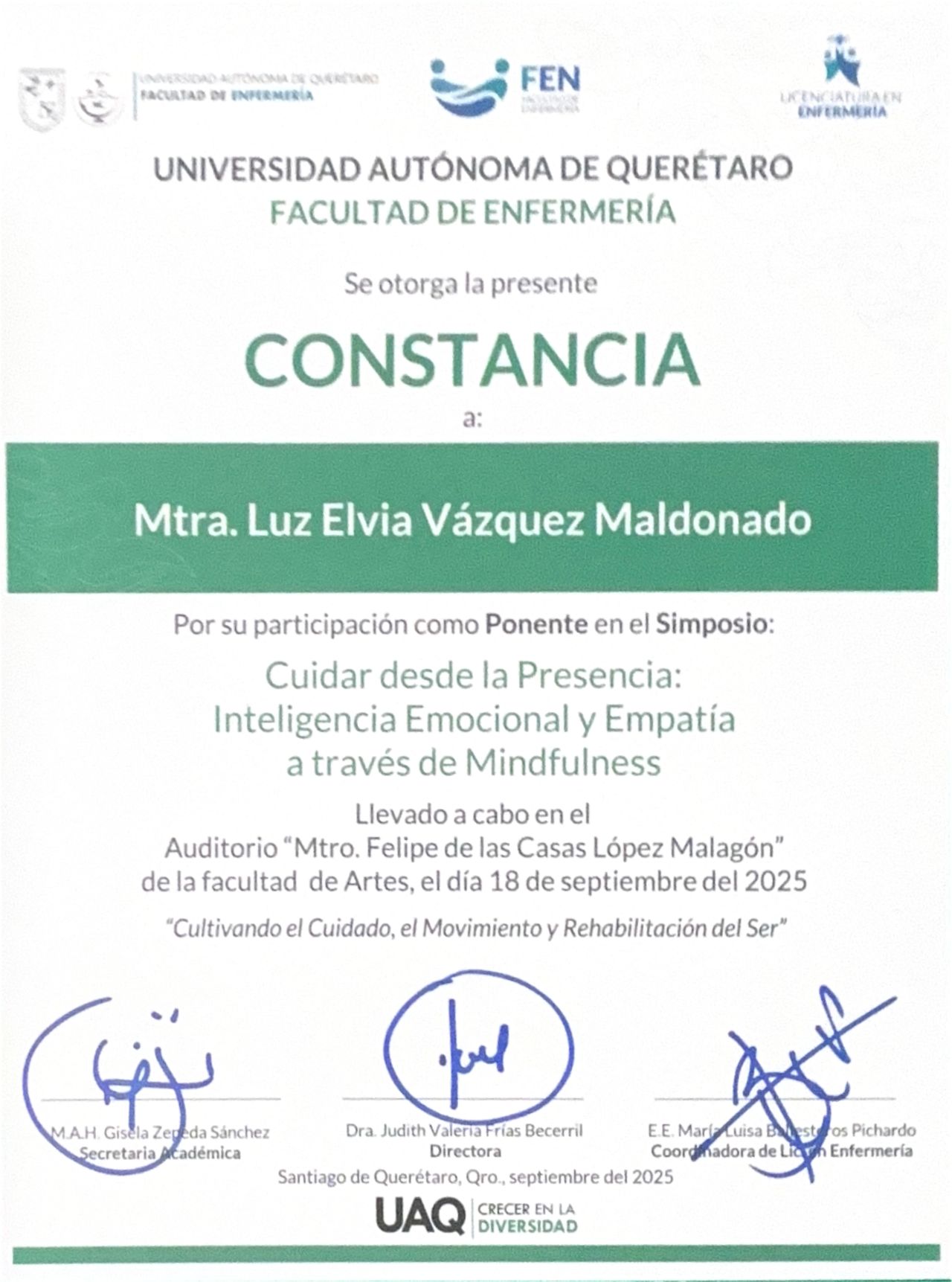 Su formación se ha enriquecido con una Maestría en Atención Plena (Mindfulness) en la Universidad UTEL y diplomados en terapia sistémica de pareja, así como su incursión en la psicología clínica de tercera generación, lo que refuerza su visión integral. Además, impulsa una Asociación de Mindfulness, donde fomenta la práctica de la meditación, el autoconocimiento y el crecimiento personal, generando un espacio accesible y transformador.