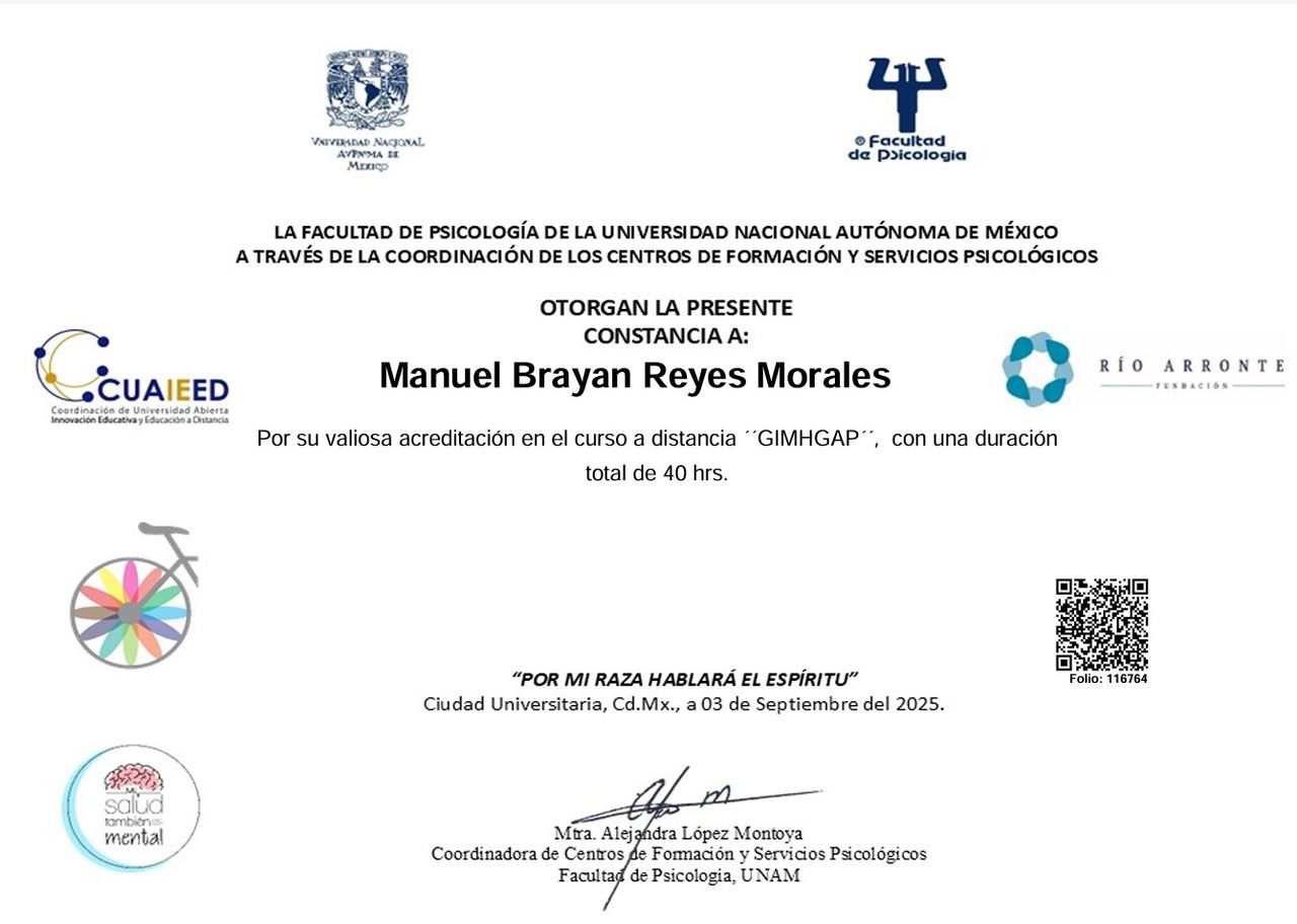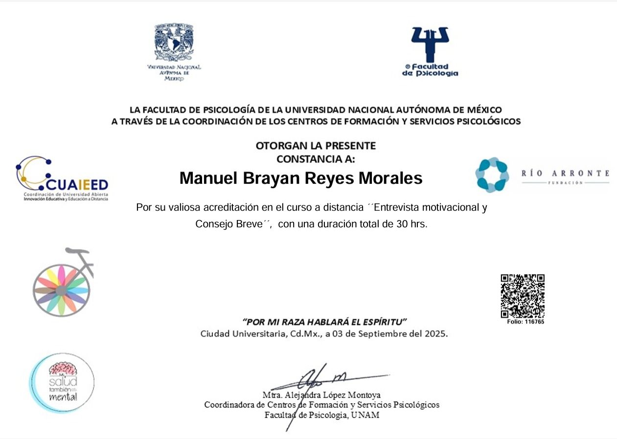 Actualmente formo parte de los Profesionales de la Salud - UNAM, brindando atención psicológica de manera remota a Mexicanos que radican en Estados Unidos mediante el modelo de Análisis Funcional de la Conducta.