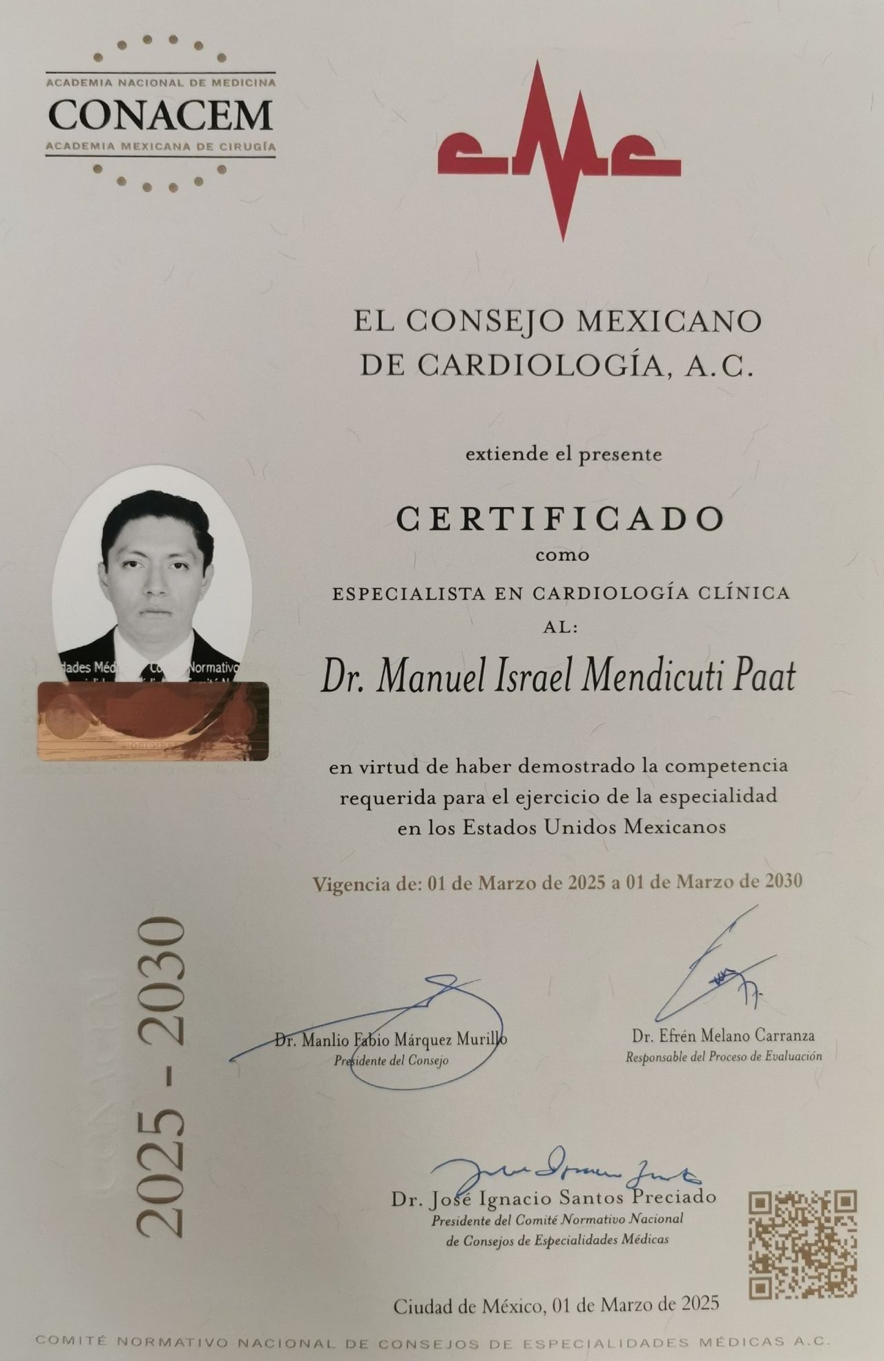 Además, estoy certificado por el Consejo Mexicano de Cardiología y sigo en constante formación en imagen cardiovascular (angiotomografía y resonancia magnética), lo que me permite ofrecerte un diagnóstico preciso y un tratamiento integral.