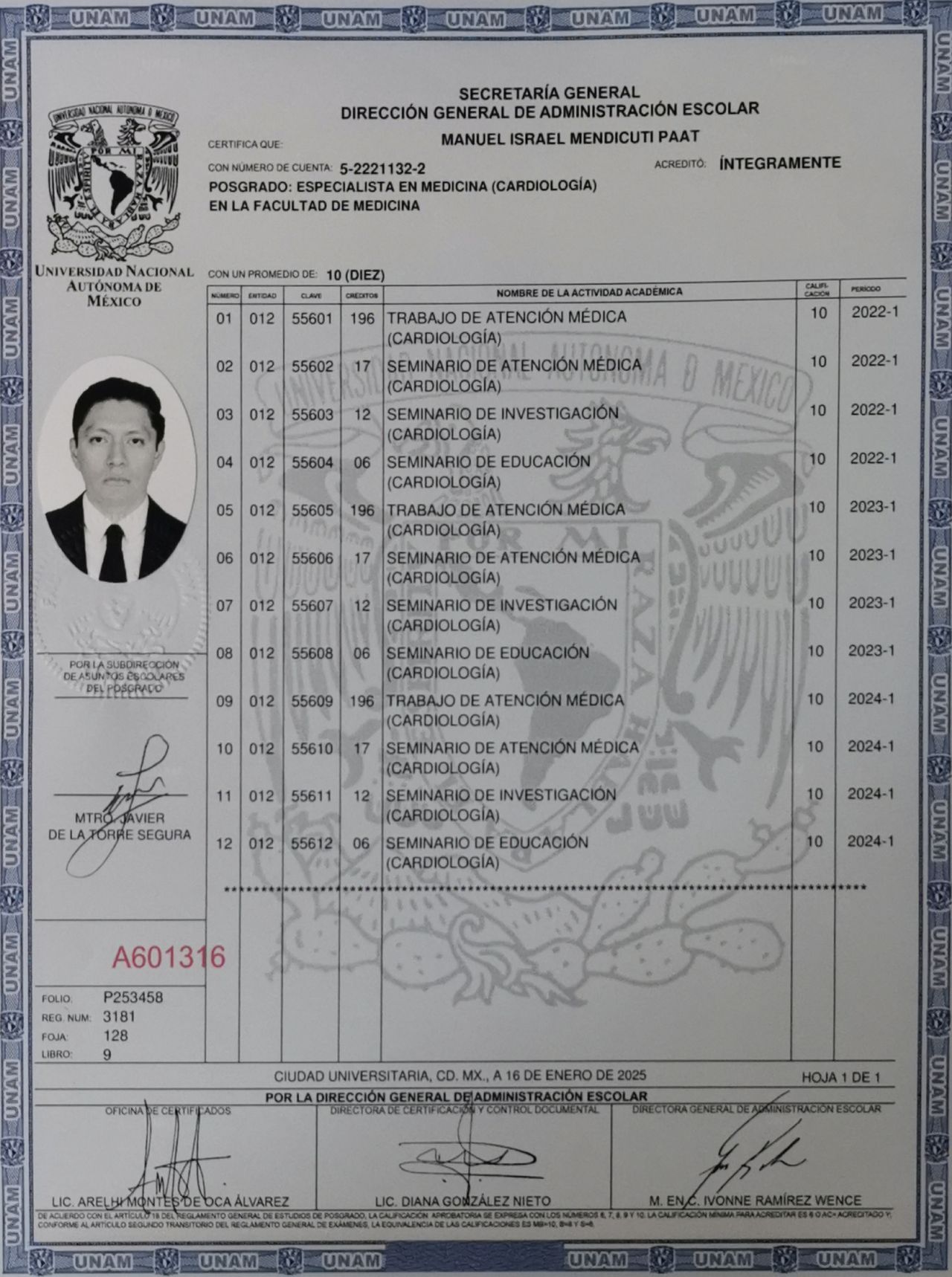 Mi misión es simple: asegurarme de que recibas una atención cardiovascular de la más alta calidad, con un enfoque humano y personalizado. Soy Médico Cirujano de la Universidad Autónoma de Campeche y me especialicé en Cardiología Clínica en el Hospital Juárez de México, una de las instituciones más relevantes del país, avalado por la UNAM.