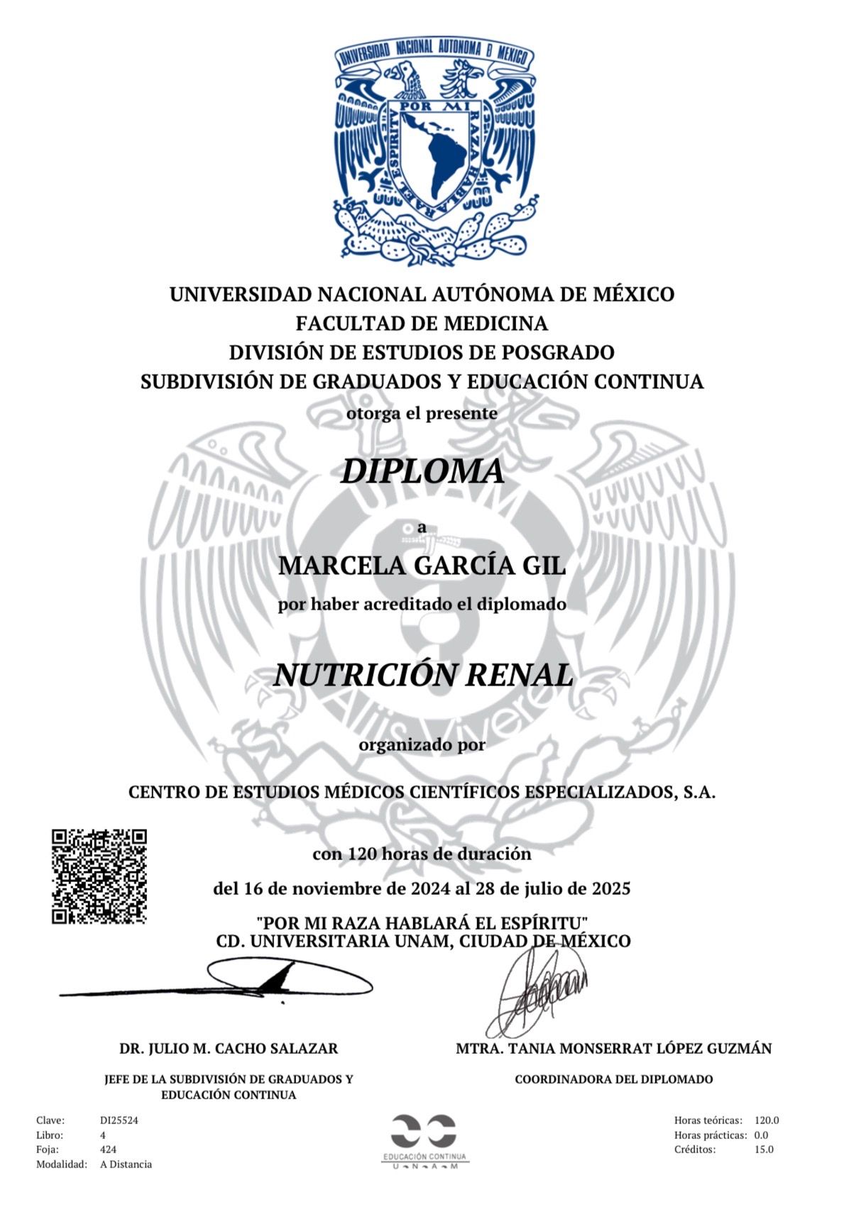 Actualmente me encuentro diplomada en Nutrición Renal y Oncológica por la UNAM