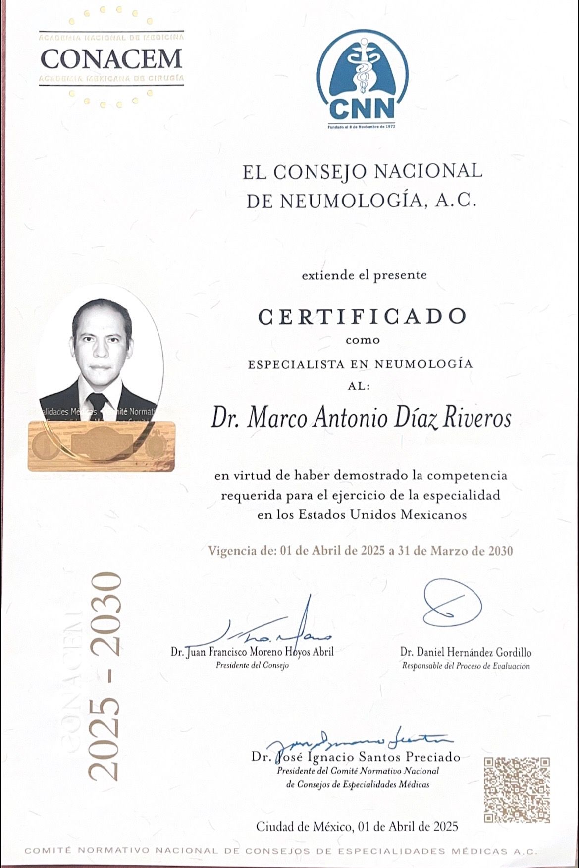 Médico Neumólogo Certificado por el Consejo Nacional de Neumologia 2020-2025.