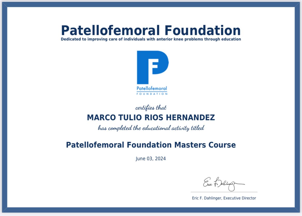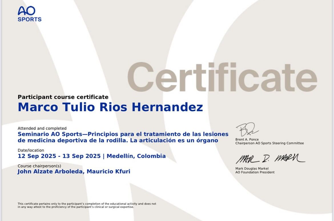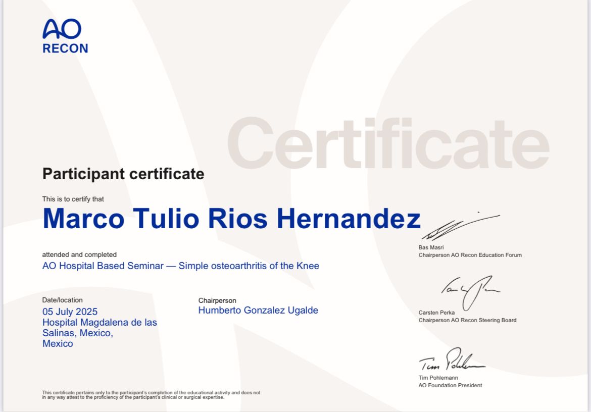 Actualmente curso la Alta Especialidad en Cirugía Artroscópica, también avalada por la UNAM, lo que me mantiene actualizado en técnicas mínimamente invasivas para el tratamiento de lesiones de hombro, cadera, rodilla y tobillo.