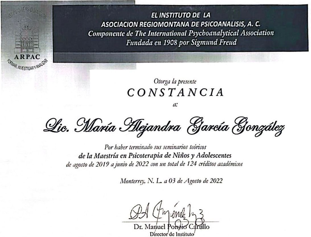 Soy Licenciada en Psicología por la Universidad Intercontinental (UIC) y tengo una Maestría en Psicoterapia Psicoanalítica, con especialidad en niños y adolescentes, formación que cursé en la Asociación Regiomontana de Psicoanálisis (ARPAC) en Monterrey, N.L.