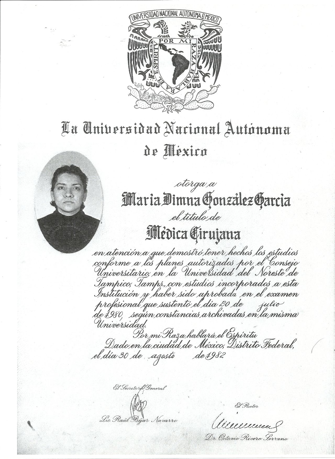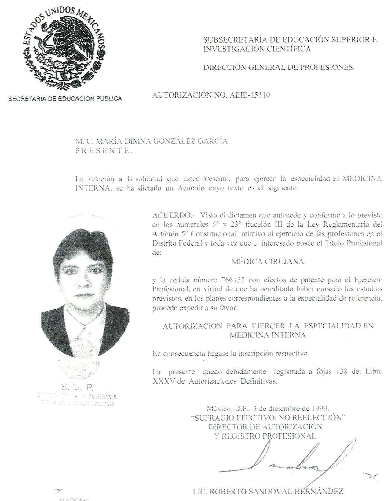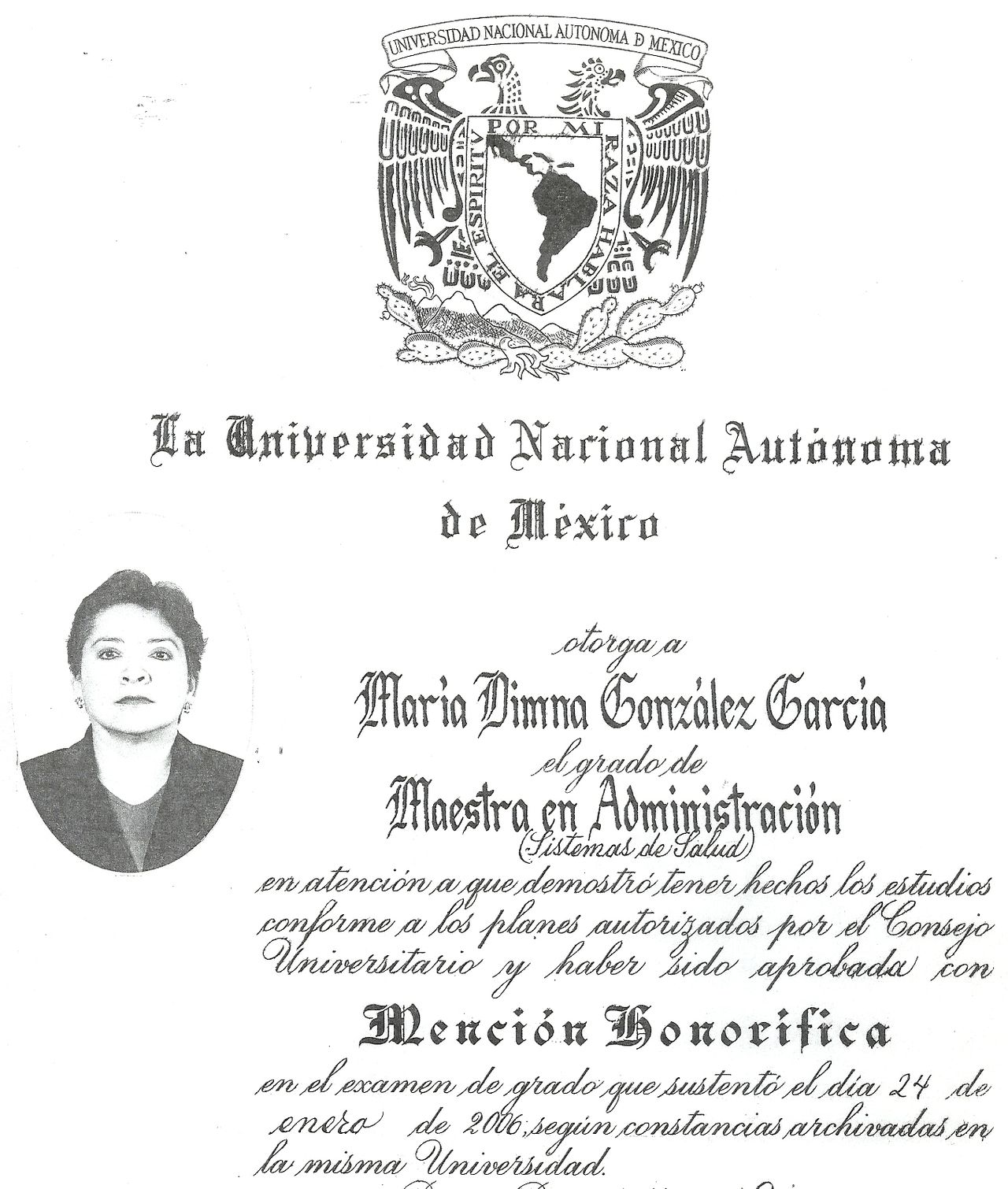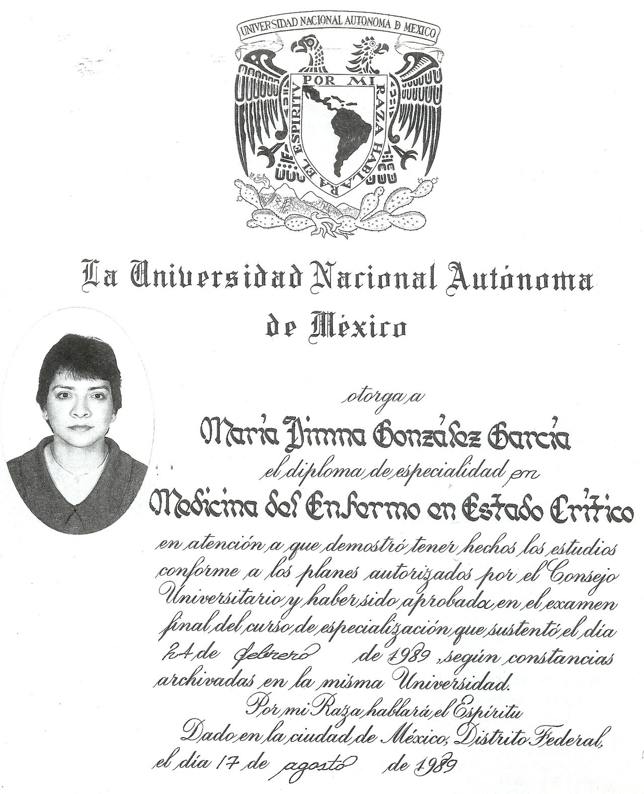 EGRESADA DE LA UNIVERSIDAD DEL NORESTE, TAMPICO, INCORPORADA A LA UNIVERSIDAD NACIONAL AUTONOMIA DE MEXICO. ESPECIALISTA EN MEDICINA INTERNA Y EN MEDICINA DEL ENFERMO EN ESTADO CRITICO. MAESTRA EN ADMINISTRACION DE SISTEMAS DE SALUD. MENCIONES HONORIFICAS EN LA ESPECIALIDAD DE MEDICINA INTERNA, EN LA ESPECIALIDAD DE MEDICINA DEL ENFERMO EN ESTADO CRITICO Y EN LA MAESTRIA DE ADMINISTRACION DE SISTEMAS DE SALUD. RECERTIFICADA EN LOS CONSEJOS MEXICANOS DE MEDICINA INTERNA Y MEDICINA DEL ENFERMO EN ESTADO CRITICO. AMPLIA EXPERIENCIA COMO ASISTENTE DE HOSPITAL, EN EL HOSPITAL CENTRAL SUR DE ALTA ESPECIALIDAD EN PETROLEOS MEXICANO. ASISTENTE DE LA DIRECCION DEL HOSPITAL PEDIATRICO DE COYOACAN, CIUDAD DE MEXICO.