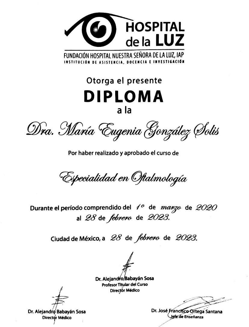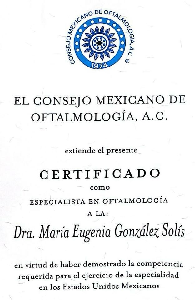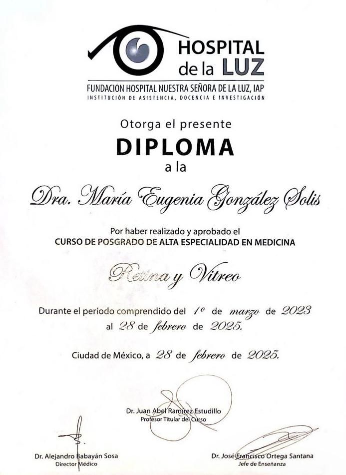 ¡Hola! Soy la Dra. María Eugenia, estudié medicina en el Instituto Tecnológico y de Estudios Superiores de Monterrey (ITESM) campus Monterrey, y posteriormente me formé como oftalmóloga en la Fundación Hospital Nuestra Señora de la Luz en la Ciudad de México, donde también realicé la alta especialidad en Retina y Vítreo.