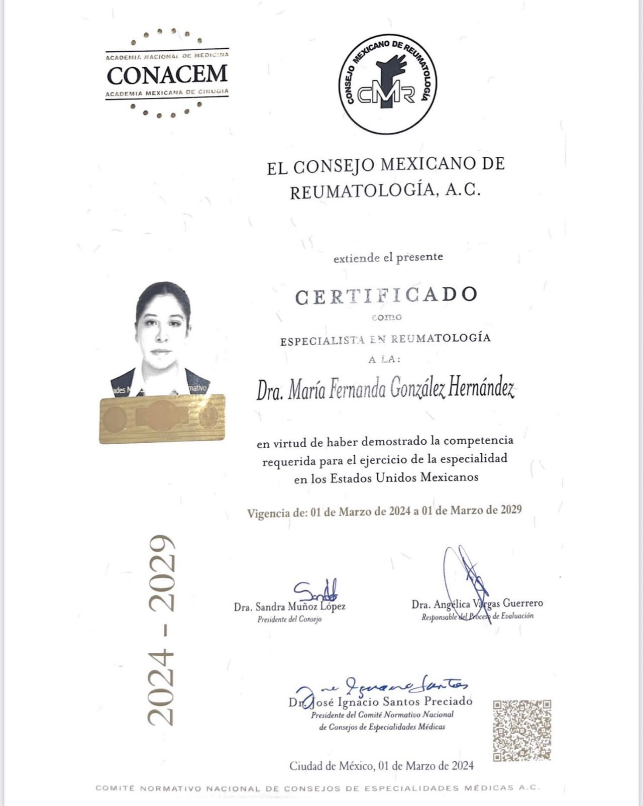 Hola, soy la doctora María Fernanda González Hernández. Soy especialista en medicina interna y reumatología, dedicada a brindar atención integral y personalizada a cada uno de mis pacientes. Cuento con certificación del Colegio Mexicano de Reumatología y formo parte del Consejo Mexicano de Reumatología.