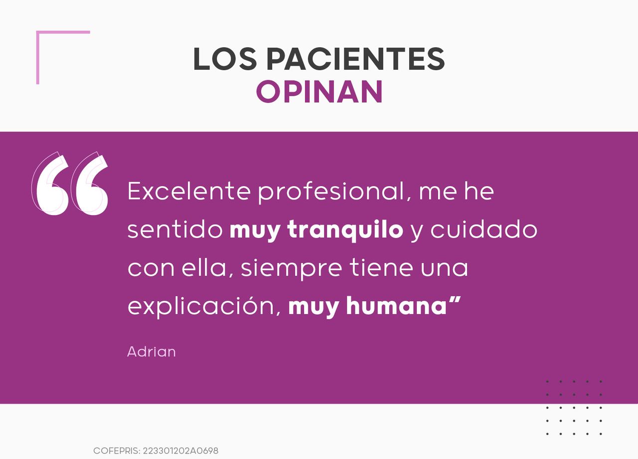 Excelente profesional, me he sentido muy tranquilo y cuidado con ella, siempre tiene una explicación, muy humana
