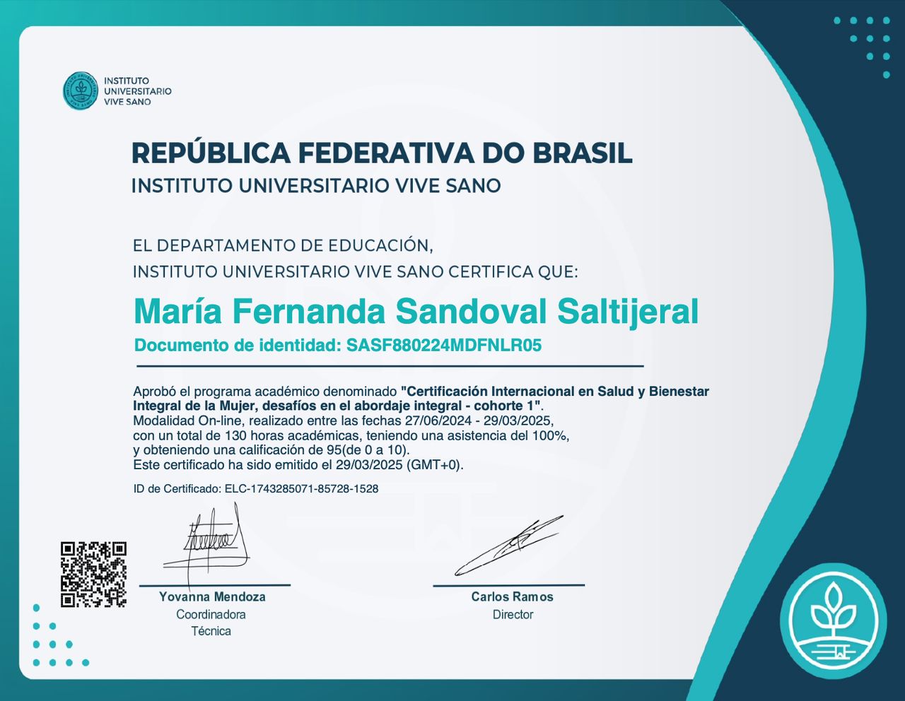 Soy María Fernanda Sandoval Saltijeral, nutrióloga con más de 14 años de experiencia. Me gradué con Mención Honorífica en la Licenciatura en Nutrición y Ciencia de los Alimentos por la Universidad Iberoamericana y obtuve una Maestría en Nutrición y Metabolismo por la Universidad de Barcelona. Además, soy Educadora en Diabetes y certificada en Nutrición Funcional, manteniéndome siempre actualizada en los avances del campo. A lo largo de mi carrera, he ayudado a más de 2,000 pacientes a lograr resultados efectivos y sostenibles a través de planes personalizados y basados en ciencia. Te ayudo a tratar condiciones como enfermedades gastrointestinales, resistencia a la insulina, diabetes, SOP, hipertensión y colesterol alto. También te acompaño en etapas clave como el embarazo, lactancia y postparto, apoyada en mi experiencia clínica y también como mamá de una niña de casi 3 años y embarazada de mi segundo bebé. En 2011 fundé Elige Nutrición con la misión de promover un estilo de vida saludable y disfrutable. Si buscas transformar tu salud de manera integral, te invito a agendar una consulta en nuestras sedes en Ciudad de México (Condesa y Santa Fe) o de manera virtual.