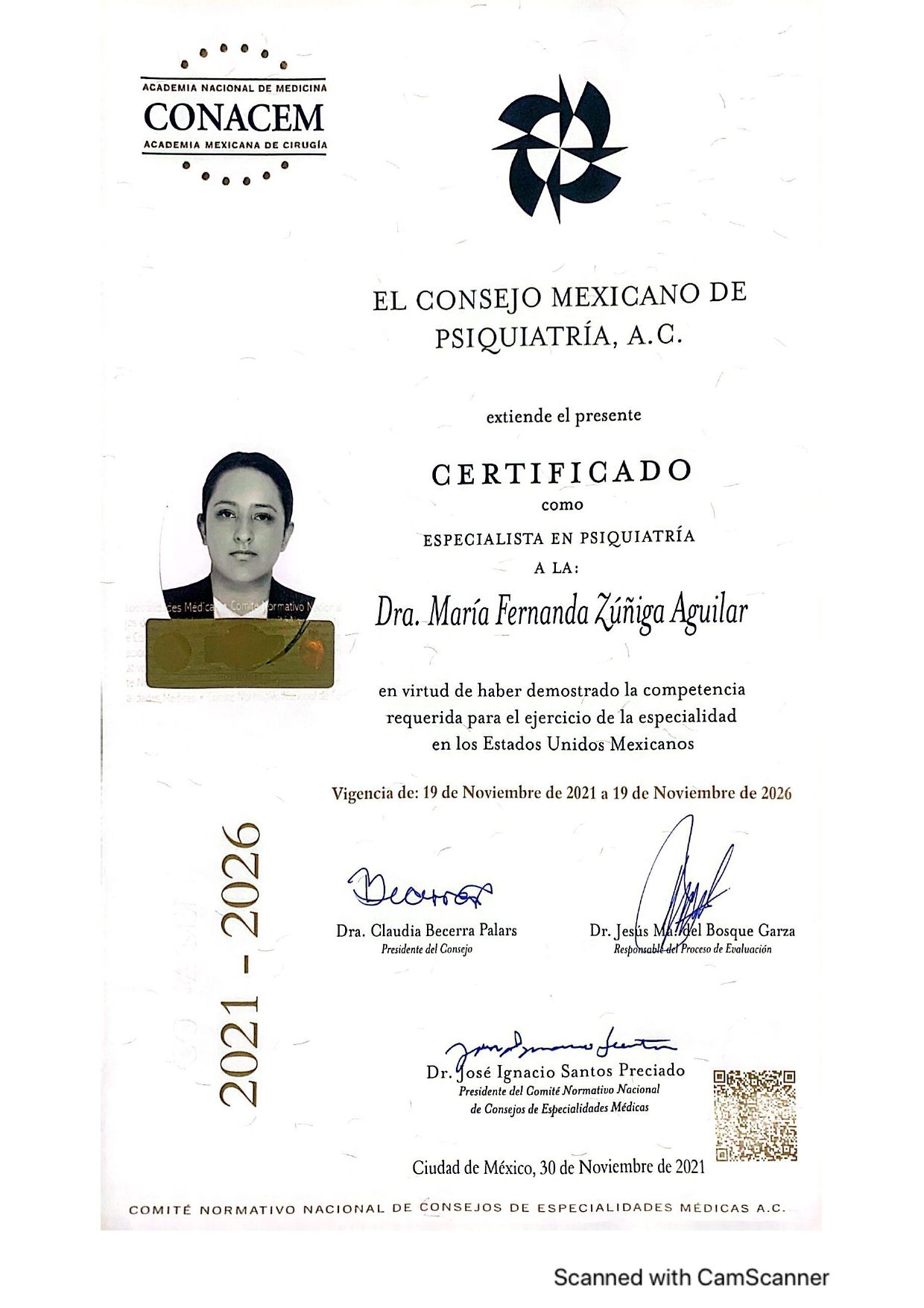 Hola, soy la Dra. Fernanda Zúñiga, médica psiquiatra con subespecialidad en psiquiatría infantil y de la adolescencia, con formación en el Hospital Psiquiátrico Fray Bernardino Álvarez y el Hospital Psiquiátrico Infantil Dr. Juan N. Navarro; con aval por parte de la Universidad Nacional Autónoma de México. Cuento con certificación vigente por el Consejo Mexicano de Psiquiatría y experiencia clínica en la atención de niños, adolescentes y adultos. Mi enfoque es integral y empático, buscando siempre comprender el contexto individual de cada persona. Ofrezco un espacio de escucha segura para acompañar procesos relacionados con salud mental desde una perspectiva basada en la evidencia, con respeto y sensibilidad.
