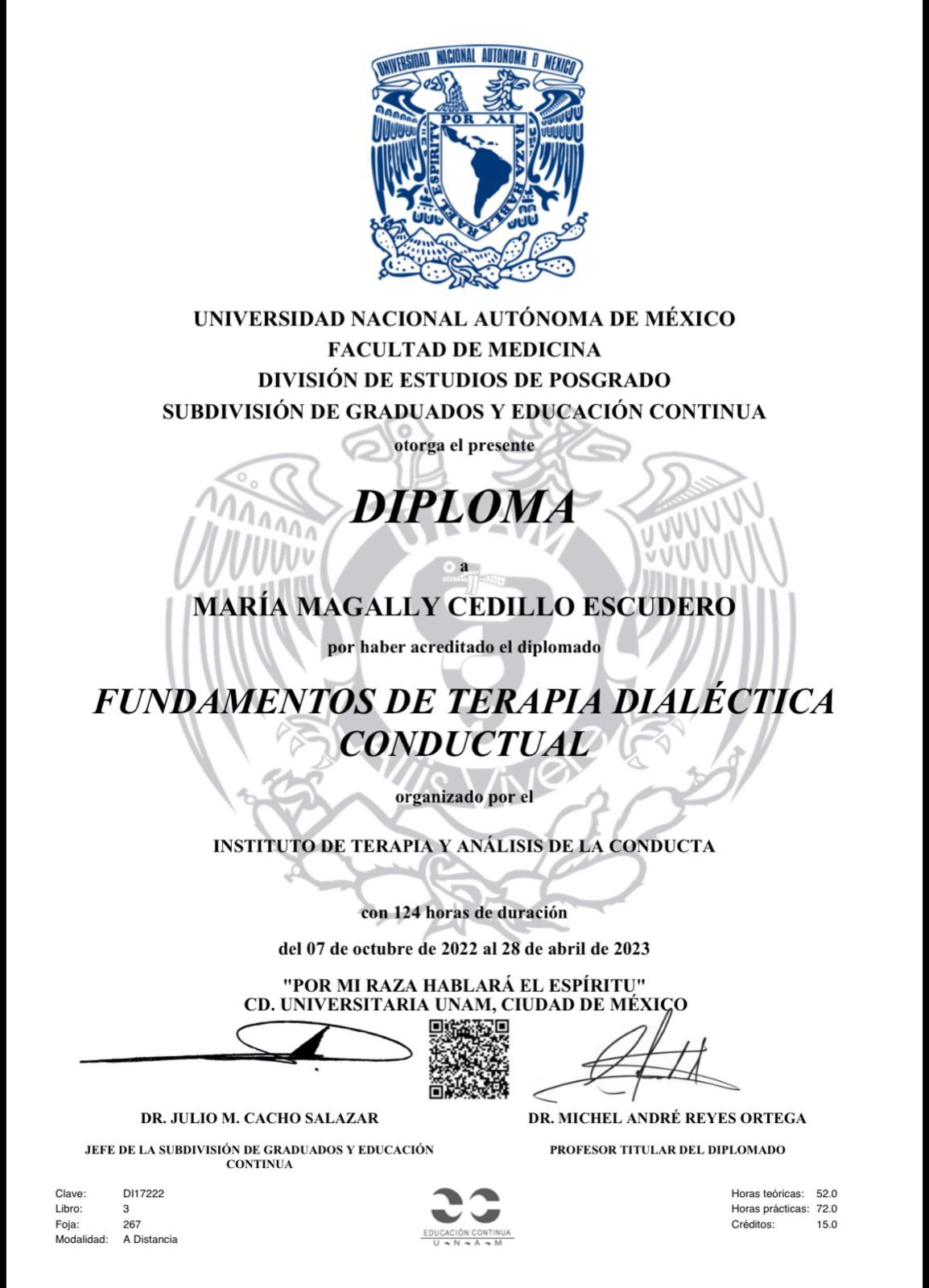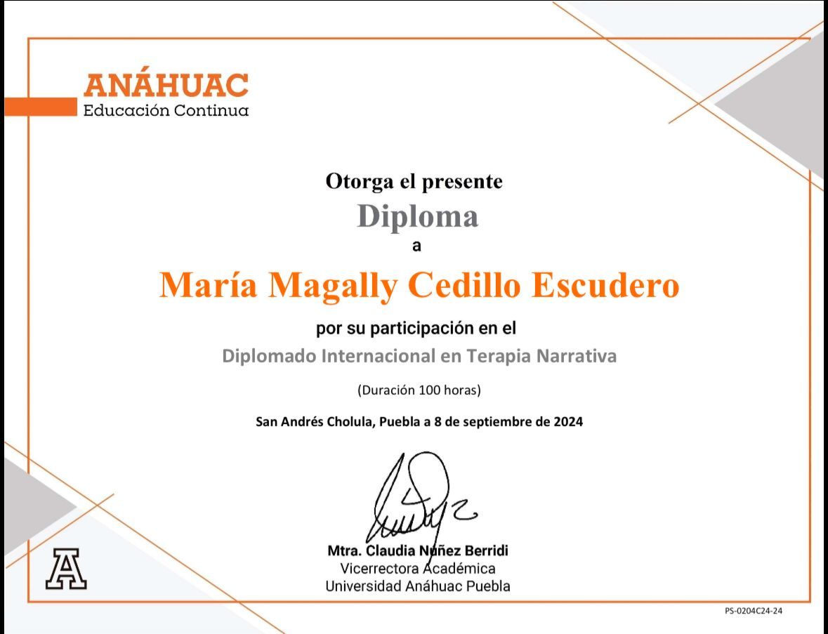 I extend my services for english-speaking population. I have a Bachelor in Clinical Psychology from Universidad de las Américas Puebla. In September 2025 I concluded a Masters in Third Generation Psychotherapies at Universidad Internacional de Valencia (online). I inccorporate cognitive behavioural therapy, and contextual therapies as my main approach, however I have a diploma in Dialectical Behavioural Therapy (DBT) from Universidad Autónoma de México and in Narrative Therapy from Universidad Anáhuac Campus Puebla and the Asociación Española de Psicología, all of which allow me to assess it´s bases depending on the case. My experience includes the application of psychometric tests in educational settings, the making of workshops for the early deteaction of violence in youth. As well as volunteering for the gender violence area at the General Hospital in San Juan del Río. I intend to create a safe place, that along with the ethical guidelines and a gender perspective allows a compassive and ethical treatment for any person in need of attention.