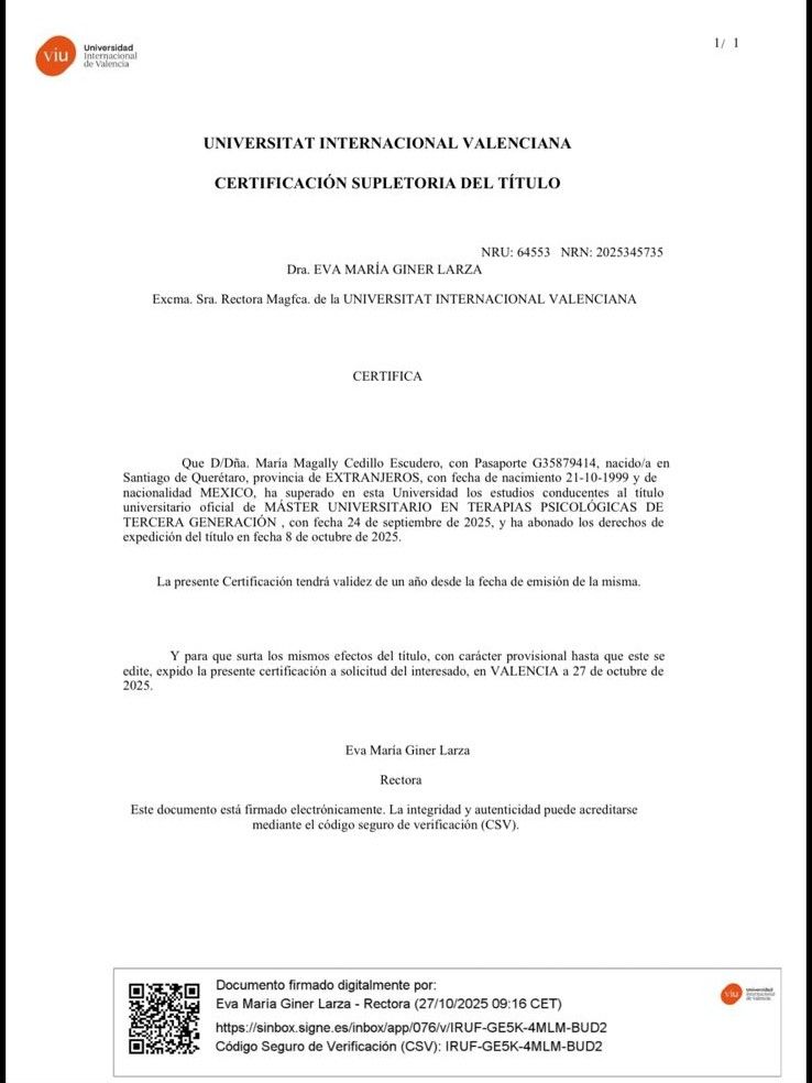 Soy Psicóloga Clínica egresada de la Universidad de las Américas Puebla (licenciatura). A partir de septiembre de 2025 soy Maestra en Terapias de Tercera Generación ya que concluí el Máster en Terapias de Tercera Generación en la Universidad Internacional de Valencia (actualmente título en trámite, cuento con el certificado supletorio de título). Trabajo con un enfoque cognitivo conductual y contextual, cuento con un Diplomado en Terapia Dialéctica Conductual de la Universidad Autónoma de México, así como un Diplomado en Terapia Narrativa de la Universidad Anáhuac Campus Puebla y avalado por la Asociación Española de Psicología Sanitaria los cuales me permiten incorporar sus fundamentos dependiendo del caso. He tenido experiencia en el ámbito educativo en la aplicación de pruebas psicométricas, creación de talleres para la detección de violencia en población adolescente. Voluntariado en el Hospital General de San Juan del Río en el área de violencia de género. Pretendo crear un espacio seguro, compasivo y ético, que se rige por la psicoética y con perspectiva de género.