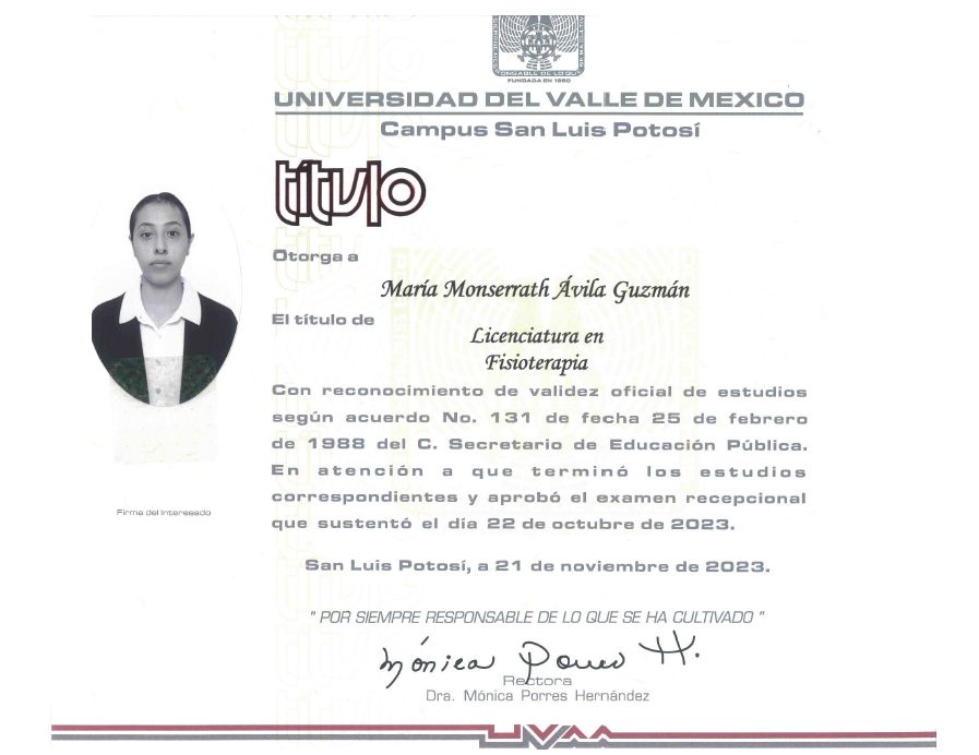 Cuento con un diplomado en Fisioterapia y Rehabilitación Geriátrica por CYCNAL ACADEMY, estoy certificada en Prescripción y Dosificación del Ejercicio Terapéutico, Electroterapia Clínica, Vendaje Neuromuscular y Funcional, Gimnasia Abdominal Hipopresiva, Fisioterapia Acuática Funcional entre otras.