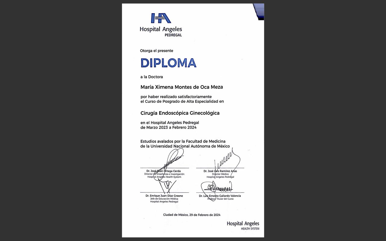 Decidí especializarme en Ginecología y Obstetricia en el Hospital Ángeles Pedregal, uno de los hospitales más reconocidos de la Ciudad de México, donde descubrí las ventajas de la cirugía de mínima invasión. Durante mi especialidad, tuve la oportunidad de viajar a Miami para adquirir y perfeccionar habilidades en cirugía robótica ginecológica.