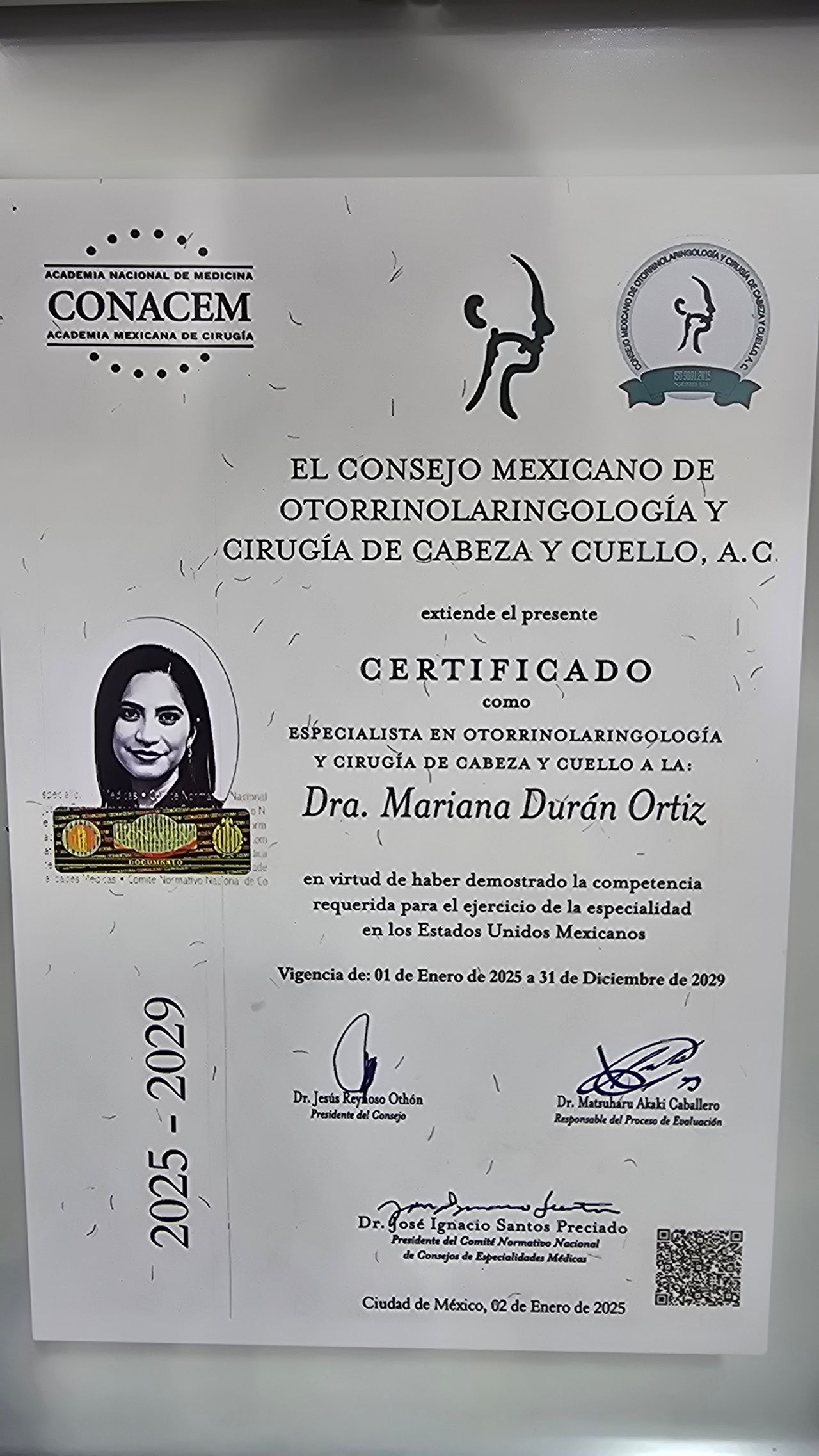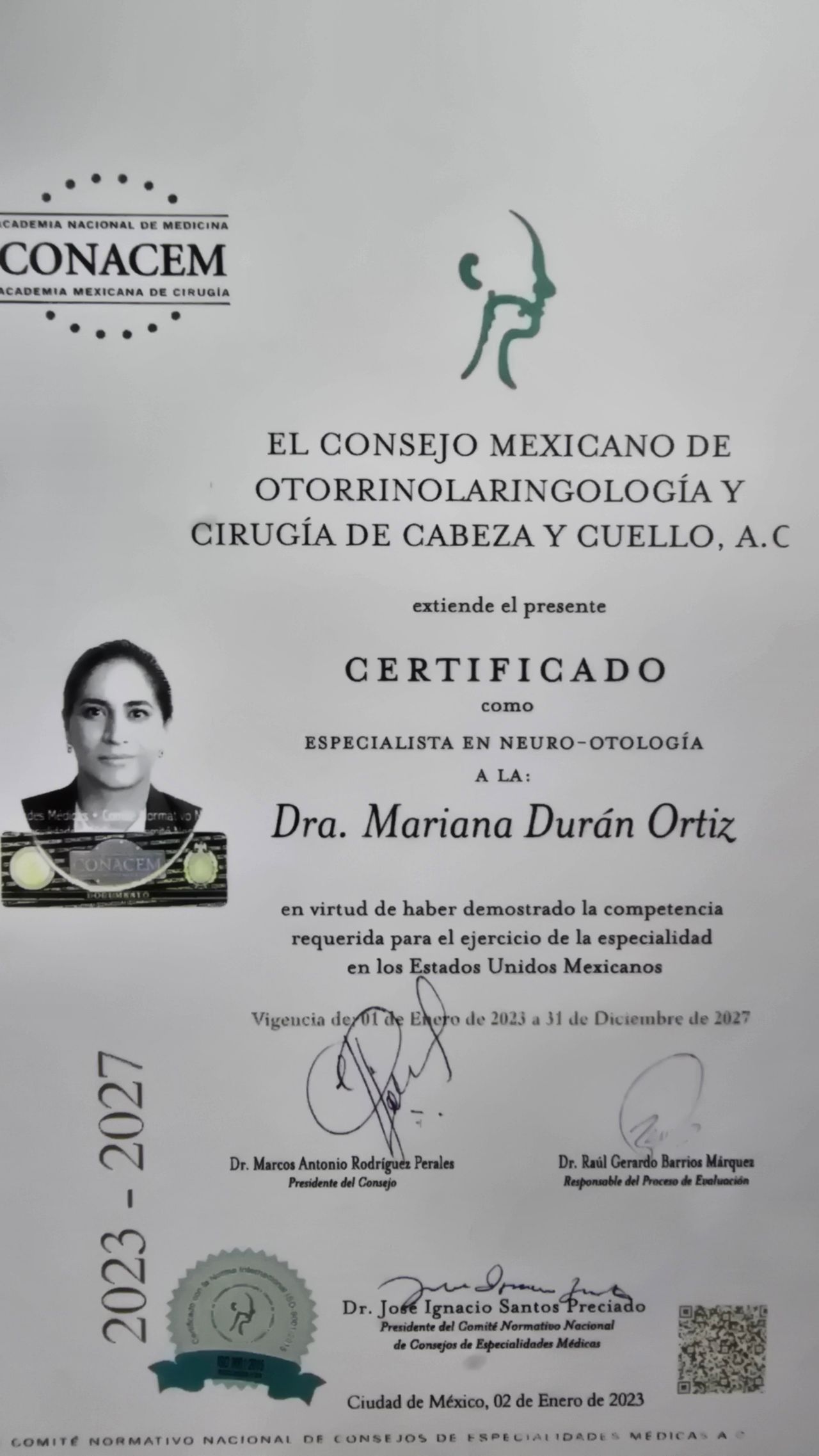Certificada por el Consejo Mexicano de Otorrinolaringologia ,Cirugia de Cabeza-Cuello (desde 2010) y Neuro-Otologia (desde 2012).