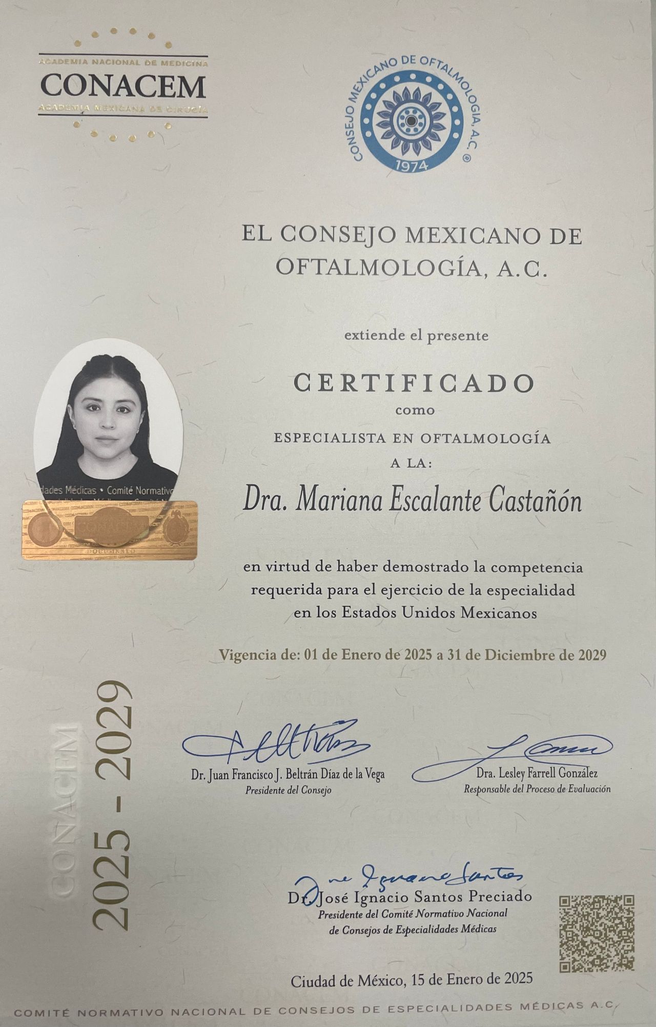 Me encuentro certificada por el Consejo Mexicano de Oftamología y por el Consejo Internacional de Oftalmología (ICO, International Council of Ophthalmology).