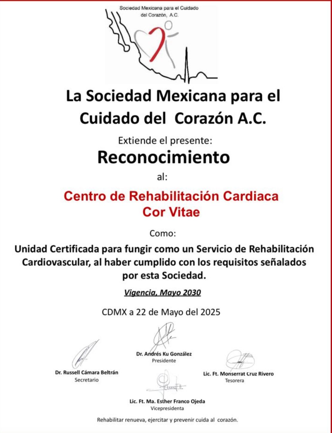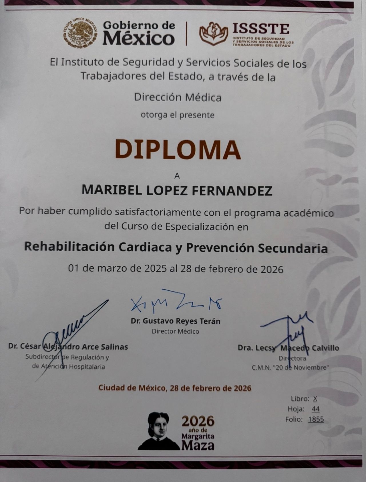 Cuento con Alta Especialidad en Rehabilitación Cardíaca Preventiva y Secundaria, egresada del Centro Médico Nacional 20 de Noviembre y avalada por la Universidad La Salle, enfocada en la recuperación y el cuidado integral de pacientes que han presentado un evento cardiovascular, como infarto, cirugía cardíaca o procedimientos como angioplastia o reemplazo valvular.