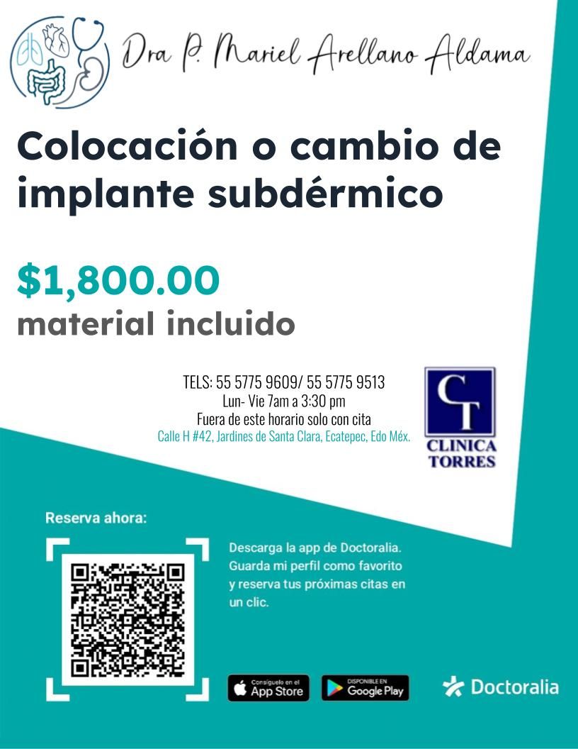 Colocación o cambio de implante subdérmico de 3 años. Incluye implante, material y procedimiento.
