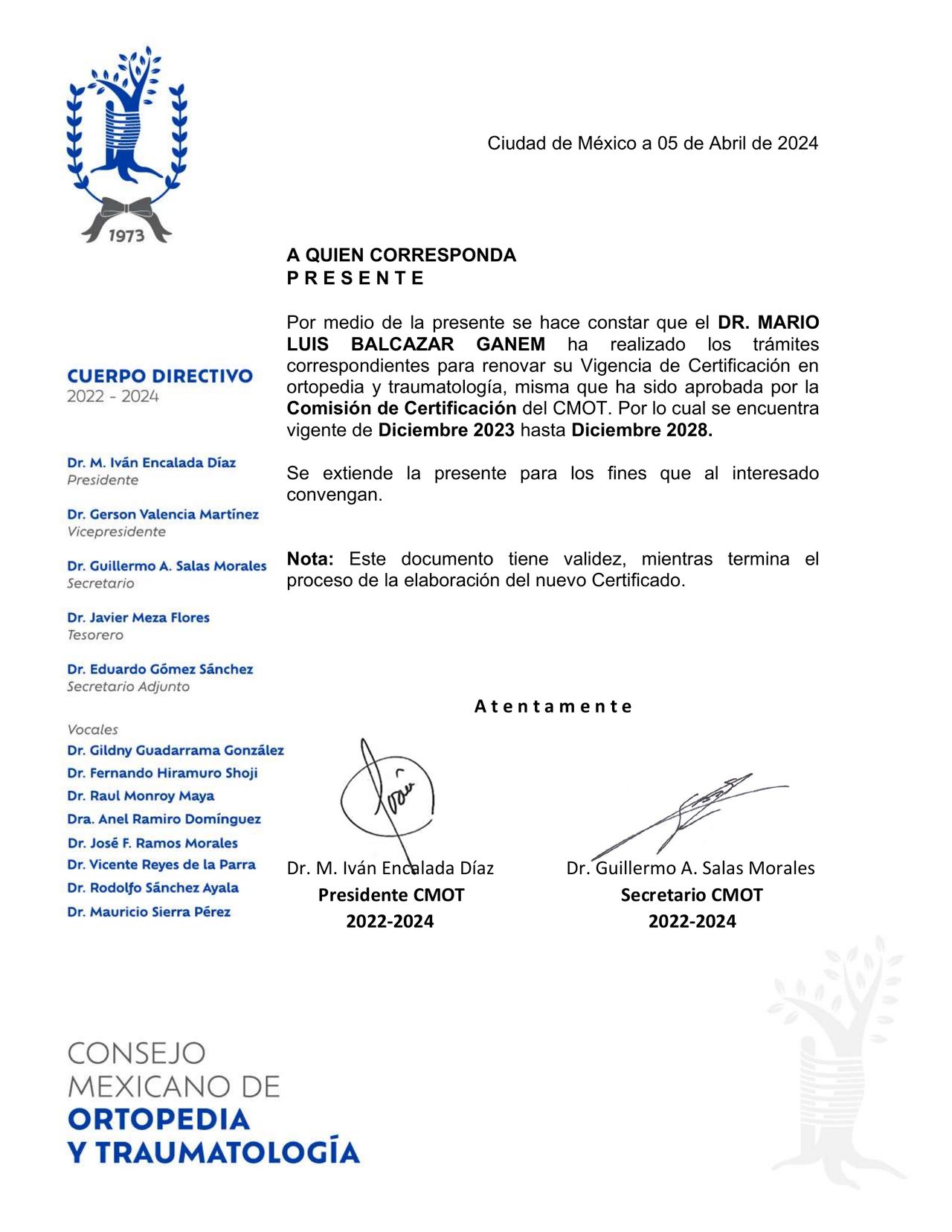 Certificado y vigente por el Consejo Mexicano de Ortopedia.
