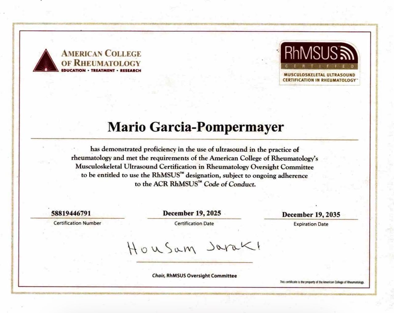 Un área destacada de su práctica es el uso del ultrasonido musculoesquelético como herramienta diagnóstica y terapéutica en Reumatología, consolidando un enfoque innovador que permite evaluar con precisión estructuras articulares y guiar intervenciones como artrocentesis e infiltraciones. Es hasta el 2026 el único reumatólogo viviendo en México con la certificación vigente (activa) del American College of Rheumatology en Ultrasonido Musculoesqueletico en Reumatologia (RhMSUS). En cuanto a su formación internacional, el Dr. García Pompermayer obtuvo la certificación en RhMSUS al presentar su examen en la Universidad de Chicago Illinois en octubre 2025. Así mismo tiene las certificaciones de la Alianza Europea de Asociaciones de Reumatología (EULAR) en ultrasonido en reumatología tras completar cursos avanzados en Copenhague, Dinamarca (2022); Atenas, Grecia (2022); y Milán, Italia (2023). Y obtuvo su certificación como profesor en ultrasonido en Reumatología en Viena, Austria, en junio de 2024.