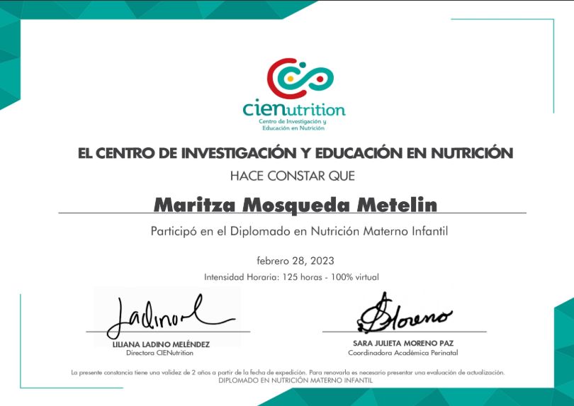 Empecé mi carrera especializándome en nutrición materno-infantil en donde he ayudado a mamás a llevar una nutrición óptima para ellas y sus bebés durante el EMBARAZO, el POSTPARTO y la ALIMENTACIÓN COMPLEMENTARIA y todo lo que conlleva alteraciones y dificultades durante estas etapas.