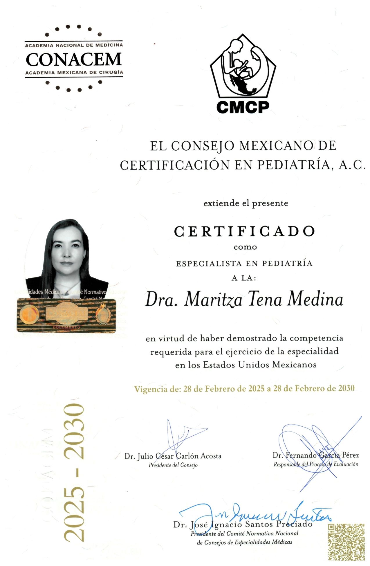 - Certificada por el Consejo Mexicano de Certificación en Pediatría como especialista en pediatría