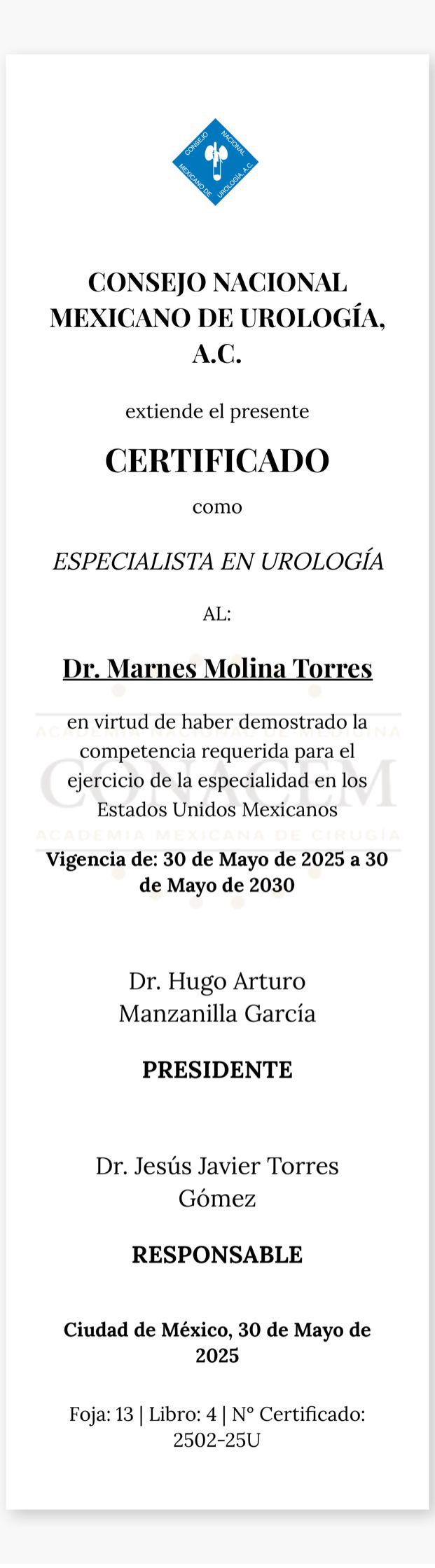 • Certificado por el Consejo Nacional Mexicano de Urología