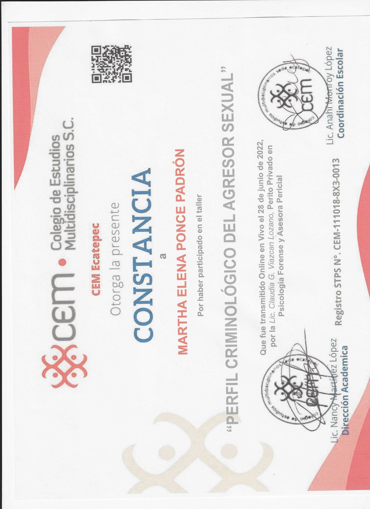 Soy Martha Elena Ponce Padrón, Psicóloga Clínica comprometida con el cuidado integral de la salud mental. Mi experiencia se centra en la atención a niños, adolescentes y adultos que atraviesan procesos de ansiedad, depresión, duelo, dificultades emocionales y problemas de conducta, sueño y alimentación.