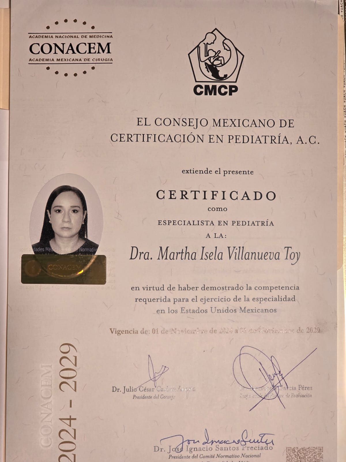 Realicé mi especialidad en Pediatría Médica en el Hospital Infantil de Especialidades de Chihuahua, avalada por la UACH y certificada ante el Consejo Mexicano de Pediatría.