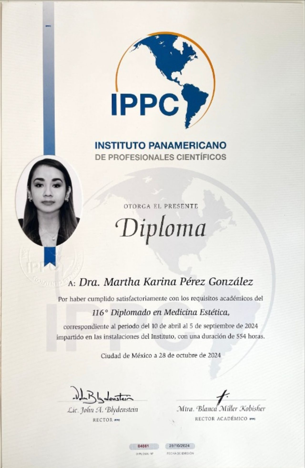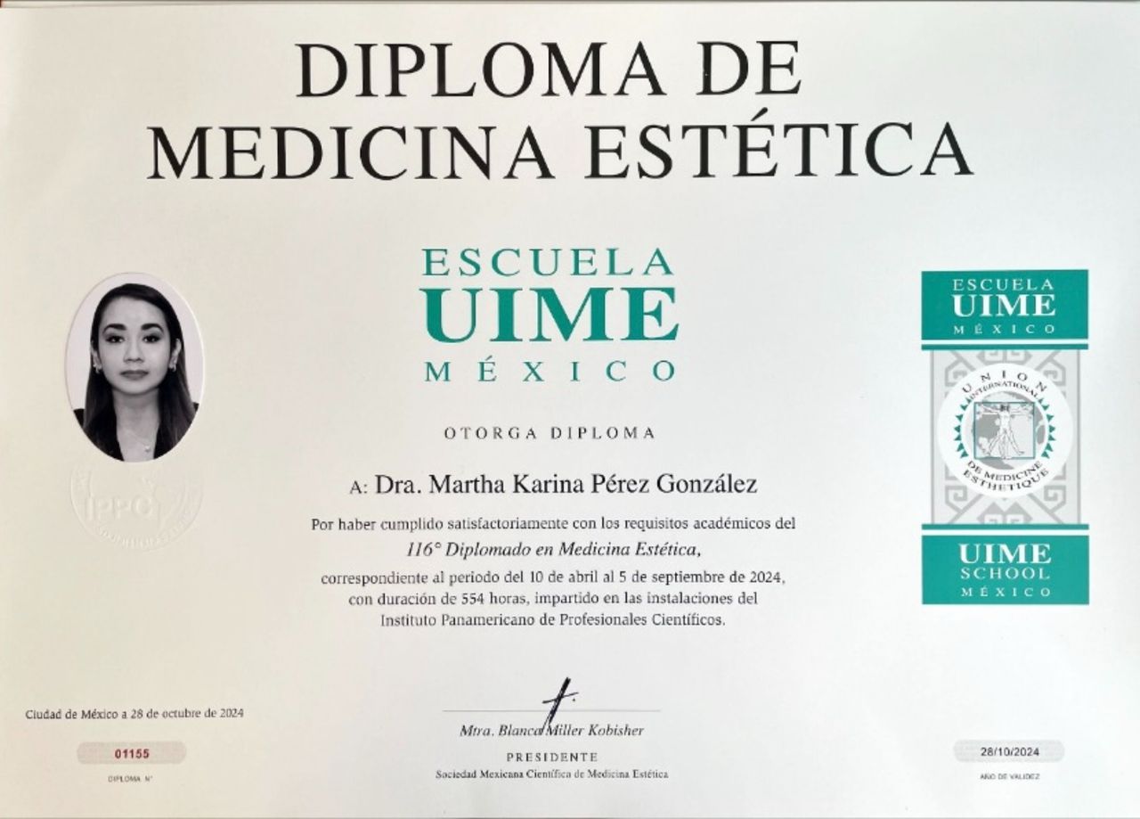 Soy Médico Colegiado Egresada de la Facultad Mexicana de Medicina de la Universidad la Salle y Médico Cirujano Estético por el Instituto Panamericano de profesionales Científicas- Sociedad Mexicana de Medicina Estética. Tomé la decisión de hacer ésta especialidad para poder mejorar la autoestima de mis pacientes mientras se encuentran en el fuerte proceso de envejecimiento, guiándolas para mejorar su calidad de vida.