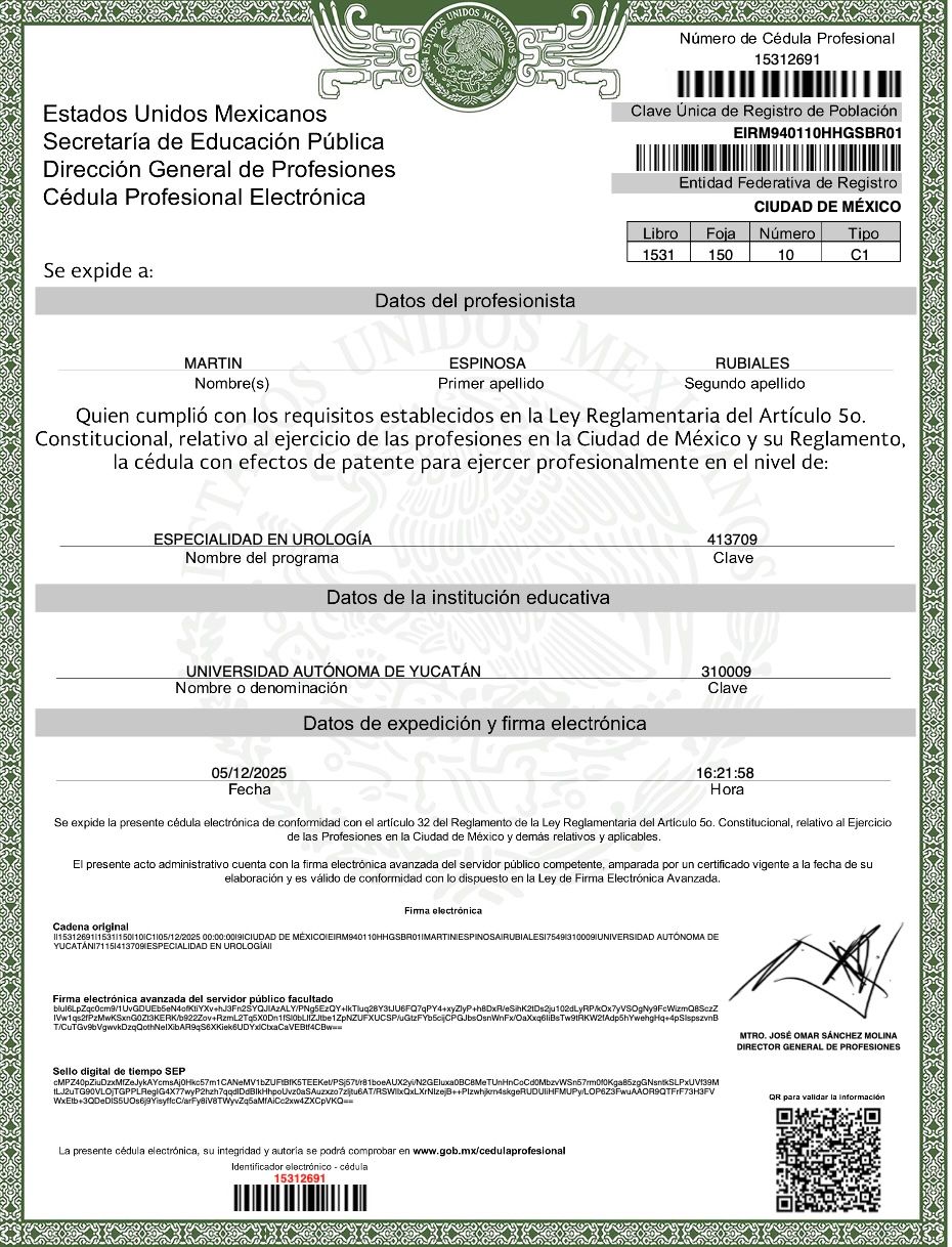 Soy el Dr Martin Espinosa Rubiales, Cirujano Urólogo con mas de 12 años de experiencia en la medicina, mi practica se enfoca en el diagnostico y tratamiento de enfermedades del tracto urinario y sistema reproductor masculino, integrando tecnología avanzada y técnicas quirúrgicas de alta precisión.
