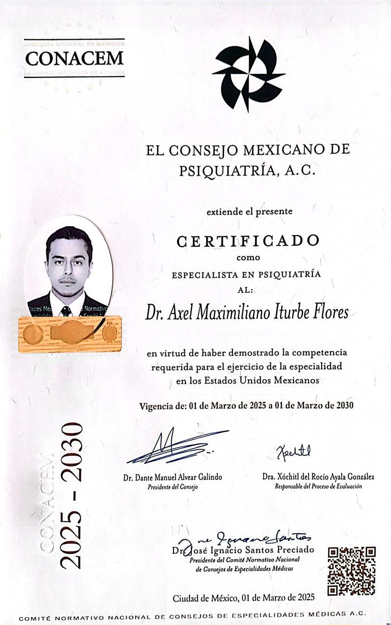 Cuido tu bienestar mental con profesionalismo y calidez. Soy médico con formación especializada en psiquiatría y salud mental, me caracteriza un trato empático y cercano: antes de proponer un tratamiento, me enfoco en escucharte, comprender lo que estás viviendo y construir contigo la mejor opción para ti. He trabajado en distintos centros y clínicas especializadas y me mantengo en constante actualización mediante estudio, cursos y congresos, tengo experiencia atendiendo a personas de todas las edades. Trabajo con padecimientos ansiedad, depresión, insomnio, estrés, TDAH, trastornos de personalidad, autismo, demencia, adicciones y otros padecimientos, siempre desde una perspectiva profesional, humana y basada en evidencia científica. Estoy aquí para acompañarte en tu proceso de bienestar mental y emocional. Aprobado por el consejo mexicano de psiquiatría y cursando actualmente el diplomado en Terapia cognitivo conductual. Also, Im currently on B1+ level of english (studing for B2 certification) , so we can talk in your language.