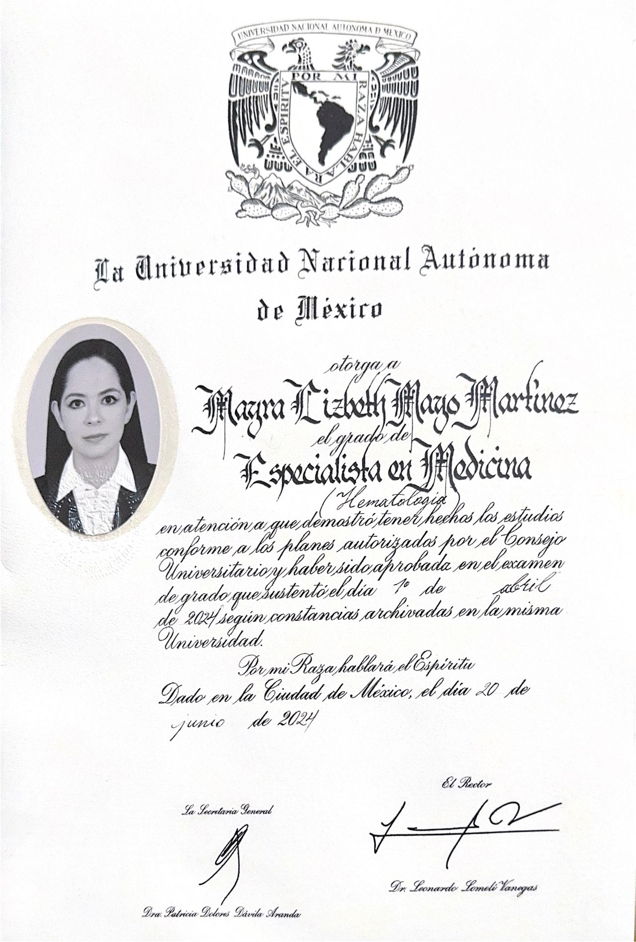 Estoy certificada por el Consejo Mexicano de Hematología y en constante actualización a través de cursos, congresos nacionales e internacionales. Mi prioridad es brindar a cada paciente una evaluación diagnóstica completa, explicar de forma clara cada diagnóstico y diseñar un tratamiento individualizado, buscando siempre el mejor resultado y la tranquilidad del paciente.
