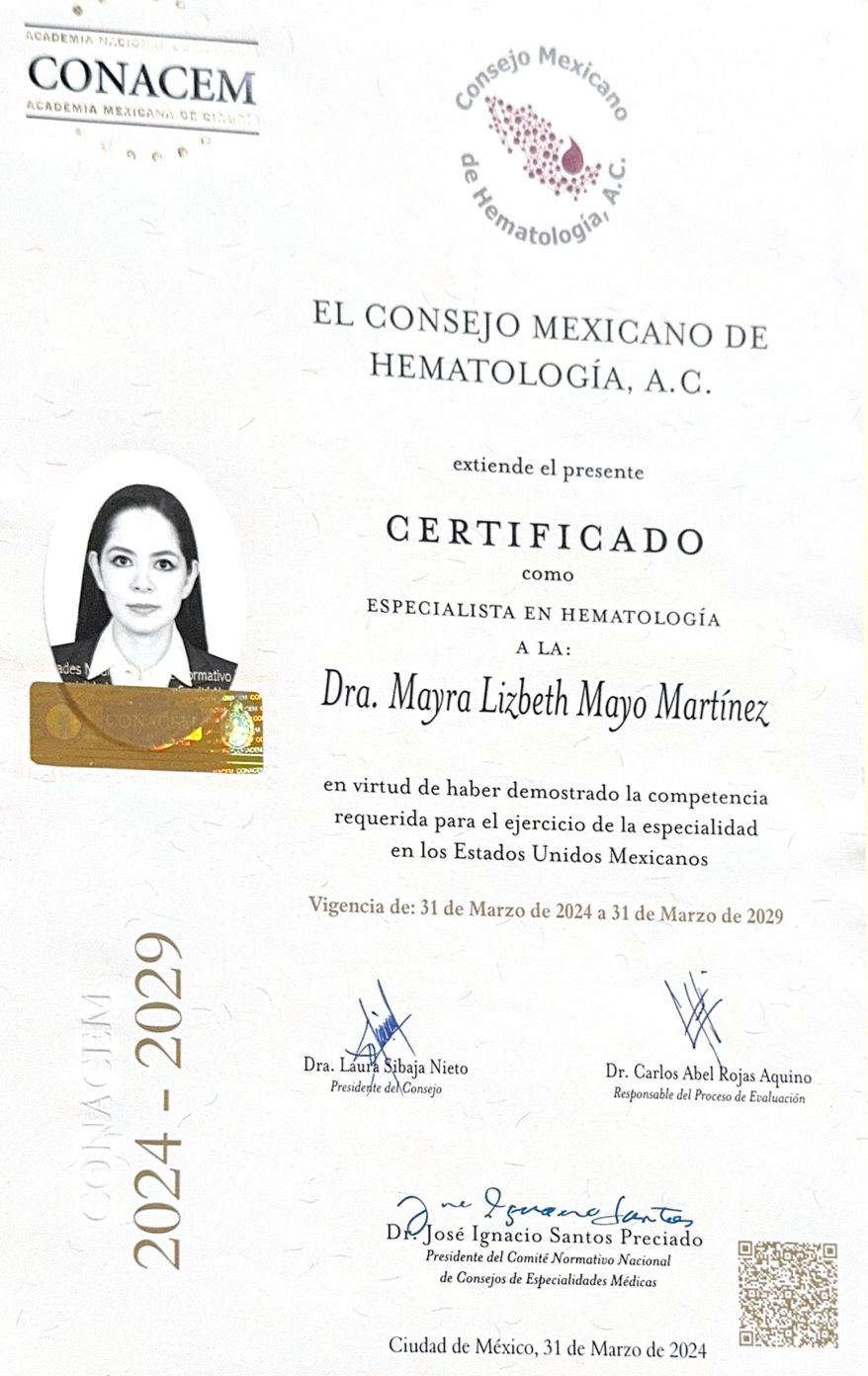 Soy la Dra. Mayra Mayo, médico especialista en Hematología, egresada de la Universidad Nacional Autónoma de México y del Hospital Juárez de México, uno de los centros de referencia nacional en enfermedades de la sangre.