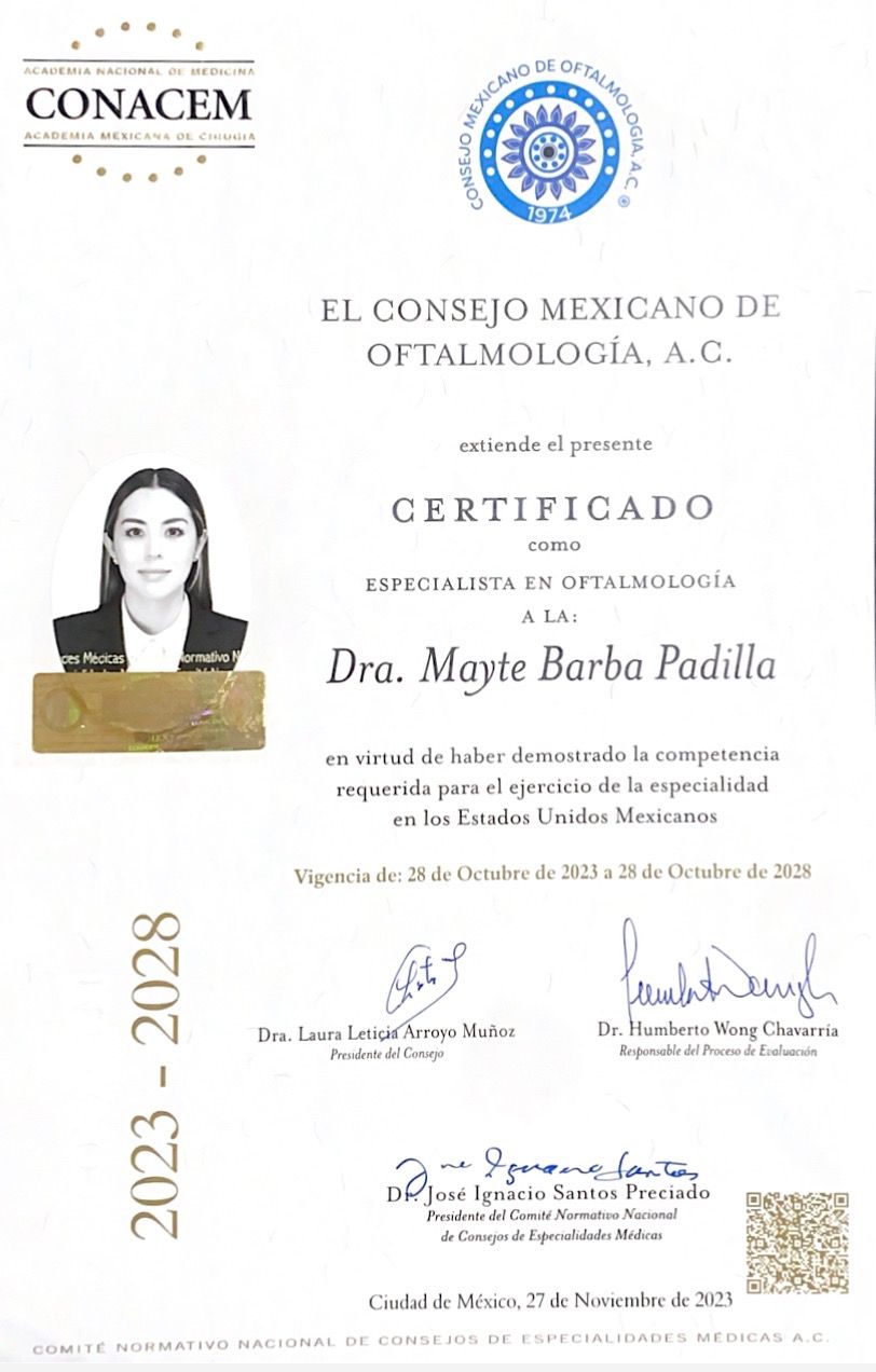 Soy la Dra. Mayte Barba, oftalmóloga certificada por el Consejo Mexicano de Oftalmología, con subespecialidad en retina médica y quirúrgica, me enfoco en la atención integral de los ojos, desde problemas visuales comunes hasta enfermedades más complejas de la retina, siempre buscando darte un diagnóstico claro y un tratamiento adecuado.